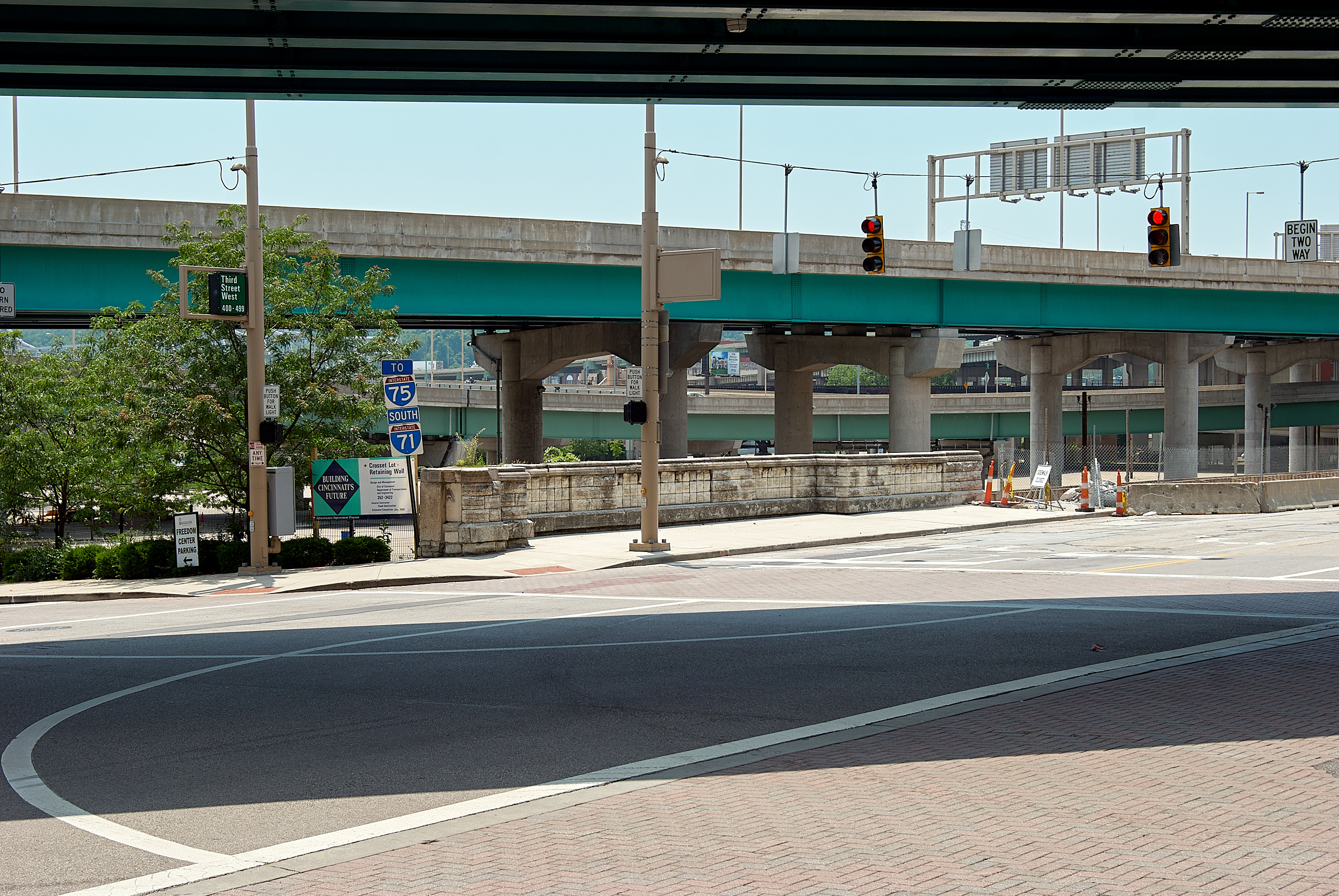 Remains of Central Union Depot at Central Avenue and Thrid Street, looking southwest. The wall at the edge of the sidewalk is actually the old foundation of the station. Central Avenue has been widened a bit in recent years, so the left side of the wall is actually not the corner of the building, but the right side of the front door.