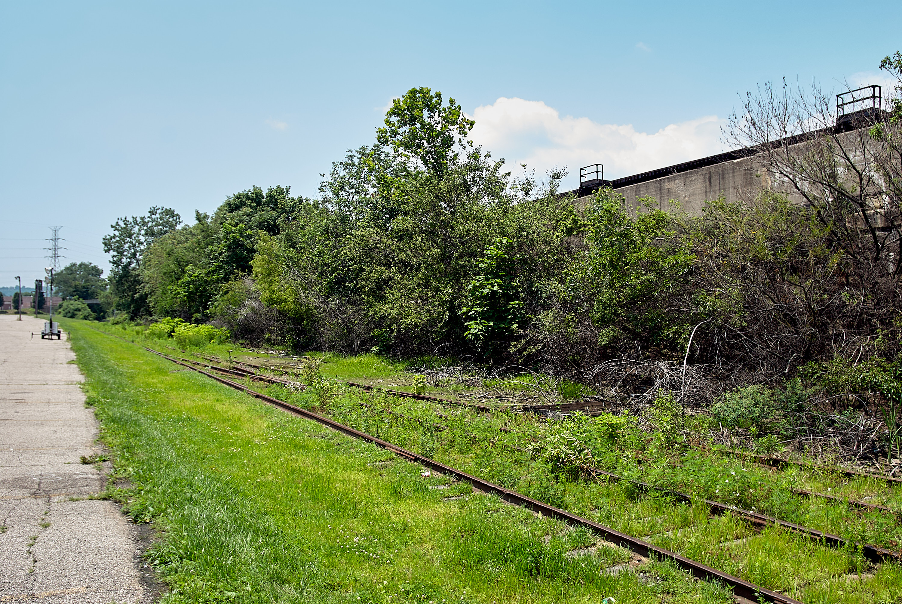 Remains of the Cincinnati & Whitewater Canal, later used by the Big Four, looking west towards Gest Street from behind Longworth Hall. From left to right the B&O freight station and yards were in the pavement, the Big Four approach to Plum Street and later Central Union Depot are the tracks in the middle, an abandoned connection from ground level to the C&O bridge for the Big Four is the concrete and stone on the right, and just above that is the still in use main approach to the C&O bridge. Occasionally freight cars are stored on these tracks, but such use is unlikely to continue much longer.