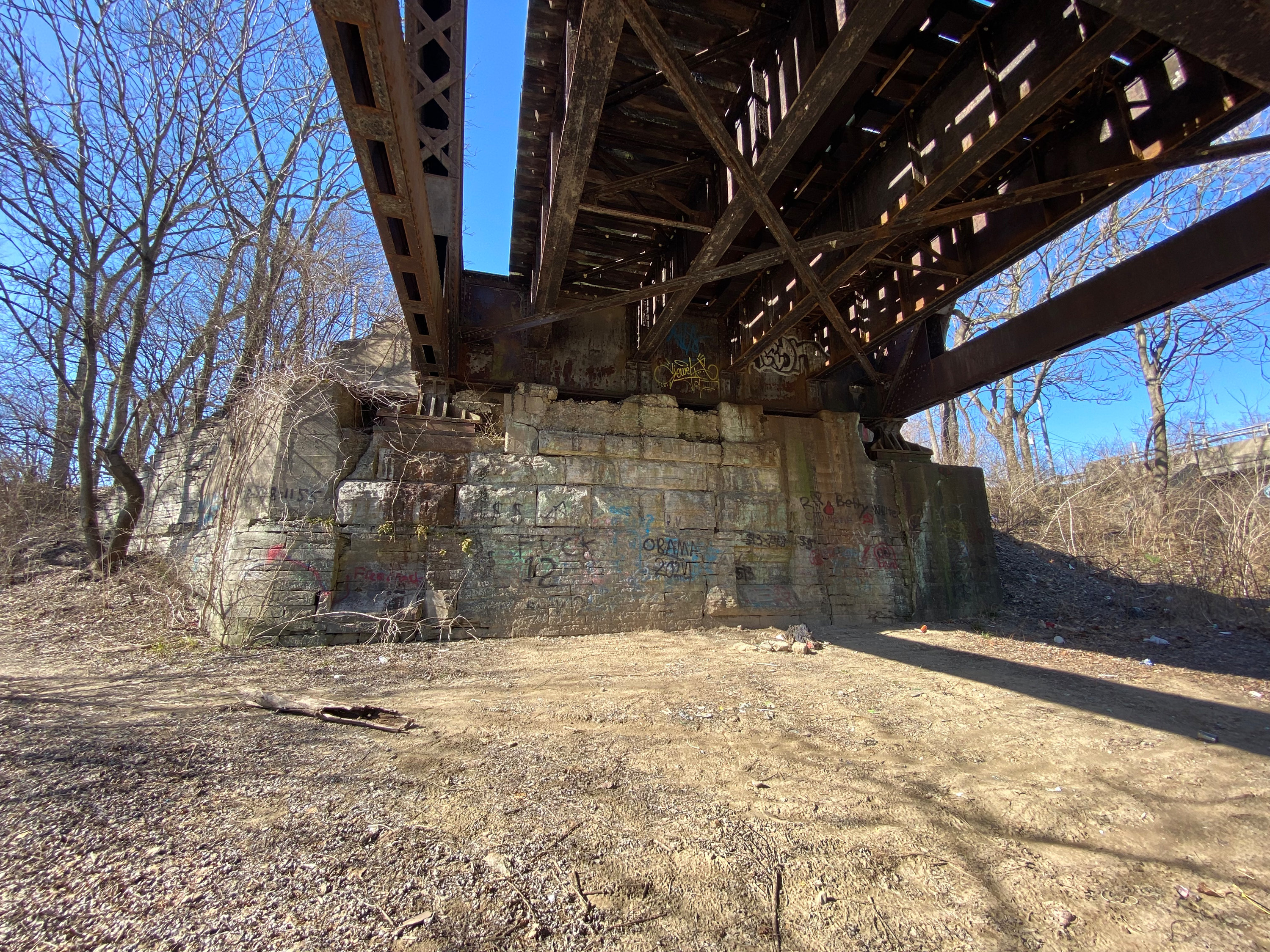 Cincinnati & Whitewater Canal aqueduct abutment on the west side of the I&O CIND, former Big Four, Great Miami River bridge in Cleves, looking west. The highway bridge is to the right. Note the two angled thrust blocks near ground level to support the angled wood posts from the aqueduct. The larger stone blocks above there are most likely infill from when the railroad was first built. The original bridge was only a single track, hence the stonework at the top under the steel cross beam. That original single track was set to the right side of the aqueduct structure, since that's where the trough was, and the towpath was on the left. The abutment was extended to the right with concrete, and also filled in on the left in 1914.