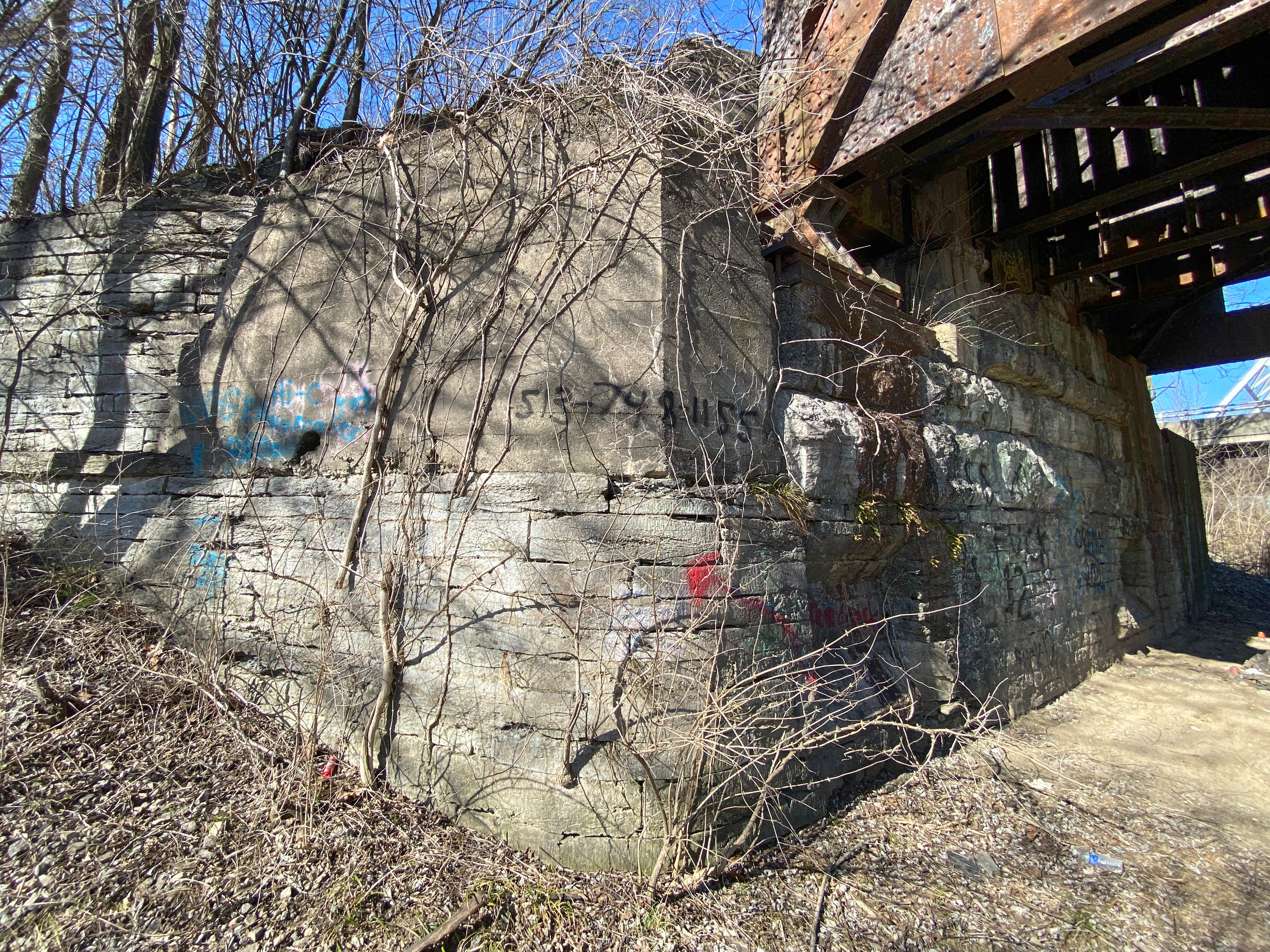 Close-up of the Cincinnati & Whitewater Canal aqueduct abutment on the west side of the I&O CIND, former Big Four, Great Miami River bridge in Cleves.