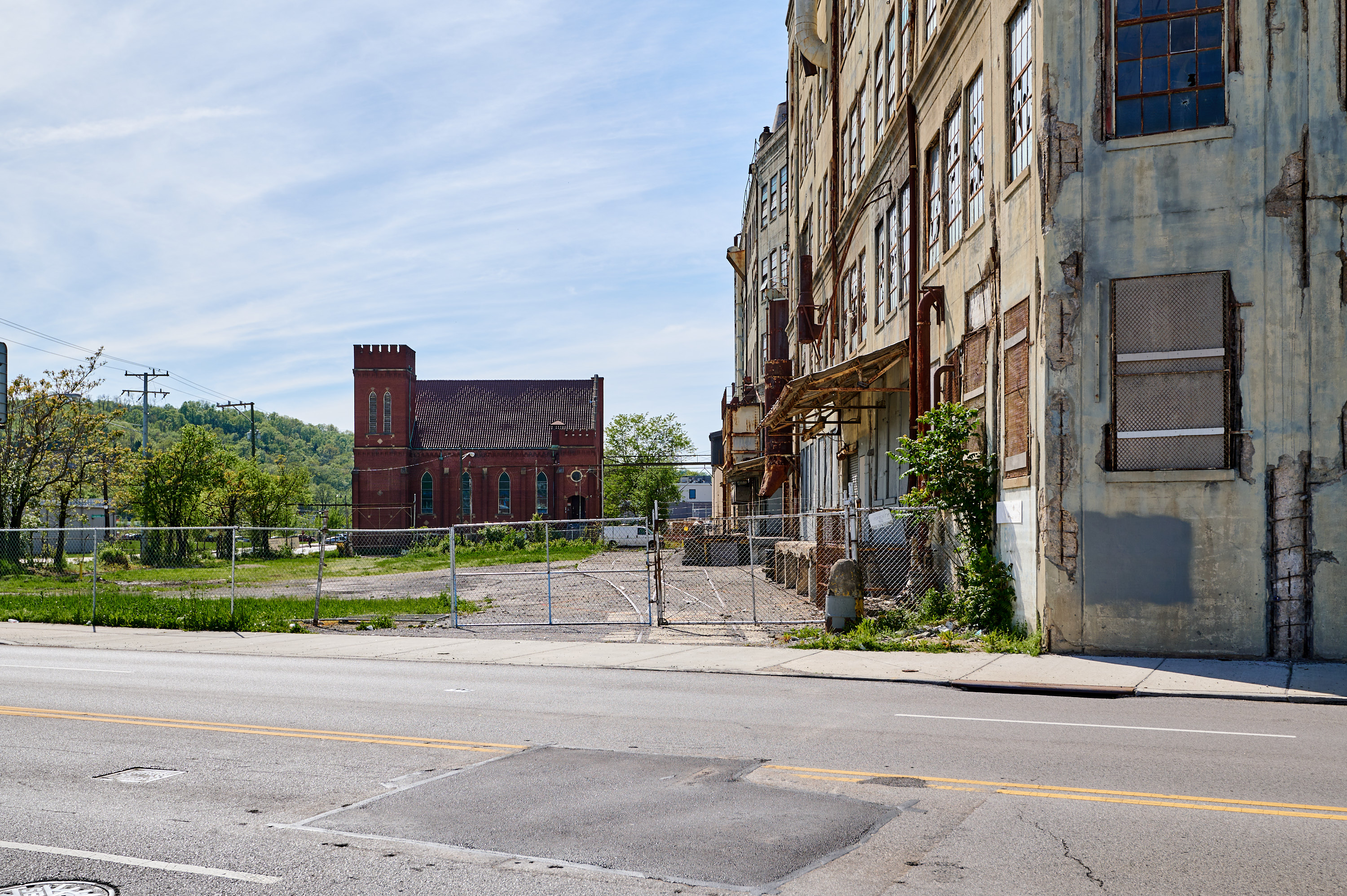 CH&D and Cincinnati & Westwood tracks on the south side of the Lunkenheimer Valve Company factory on Beekman Avenue, looking west across Beekman.