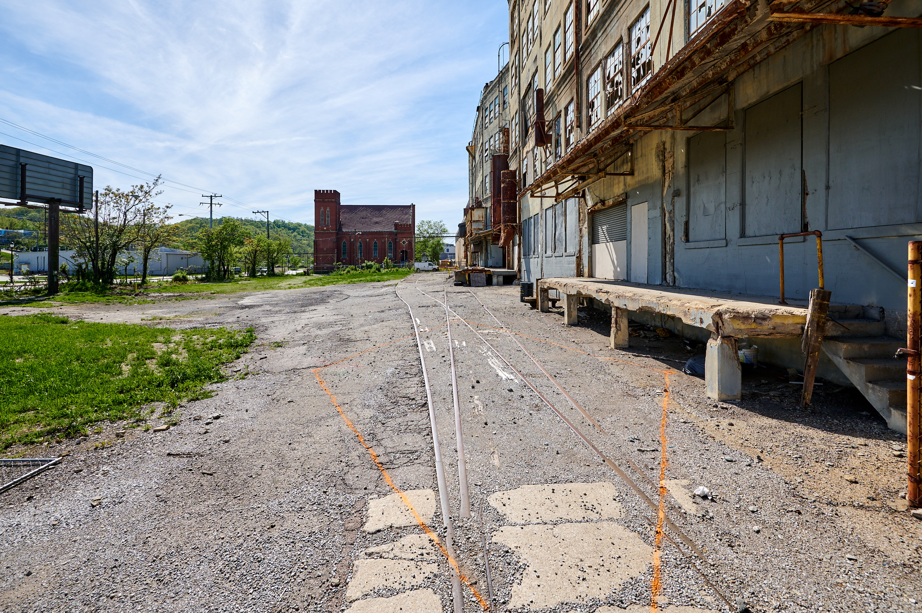 CH&D and Cincinnati & Westwood tracks on the south side of the Lunkenheimer Valve Company factory on Beekman Avenue, looking west across Beekman. This was the Cincinnati & Westwood's main line. After abandonment, the CH&D and later B&O took over service to the factory.