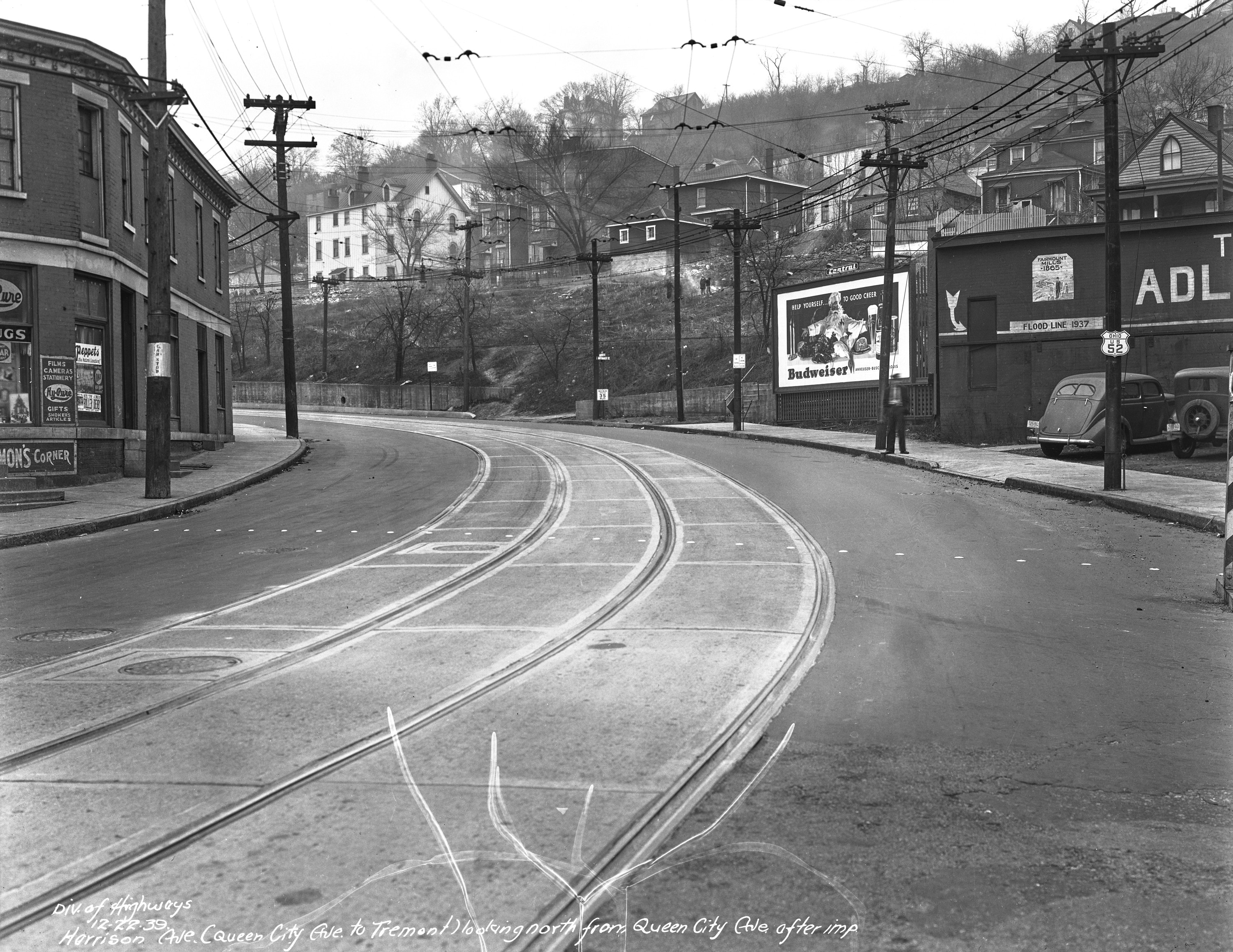 Historic photo of streetcar tracks starting the long climb up Harrison Avenue in South Fairmount, with the Cincinnati & Westwood's tracks on the hill above, looking northwest from Queen City Avenue. From the University of Cincinnati Library Digital Resource Commons, Street Construction and Improvements collection.
