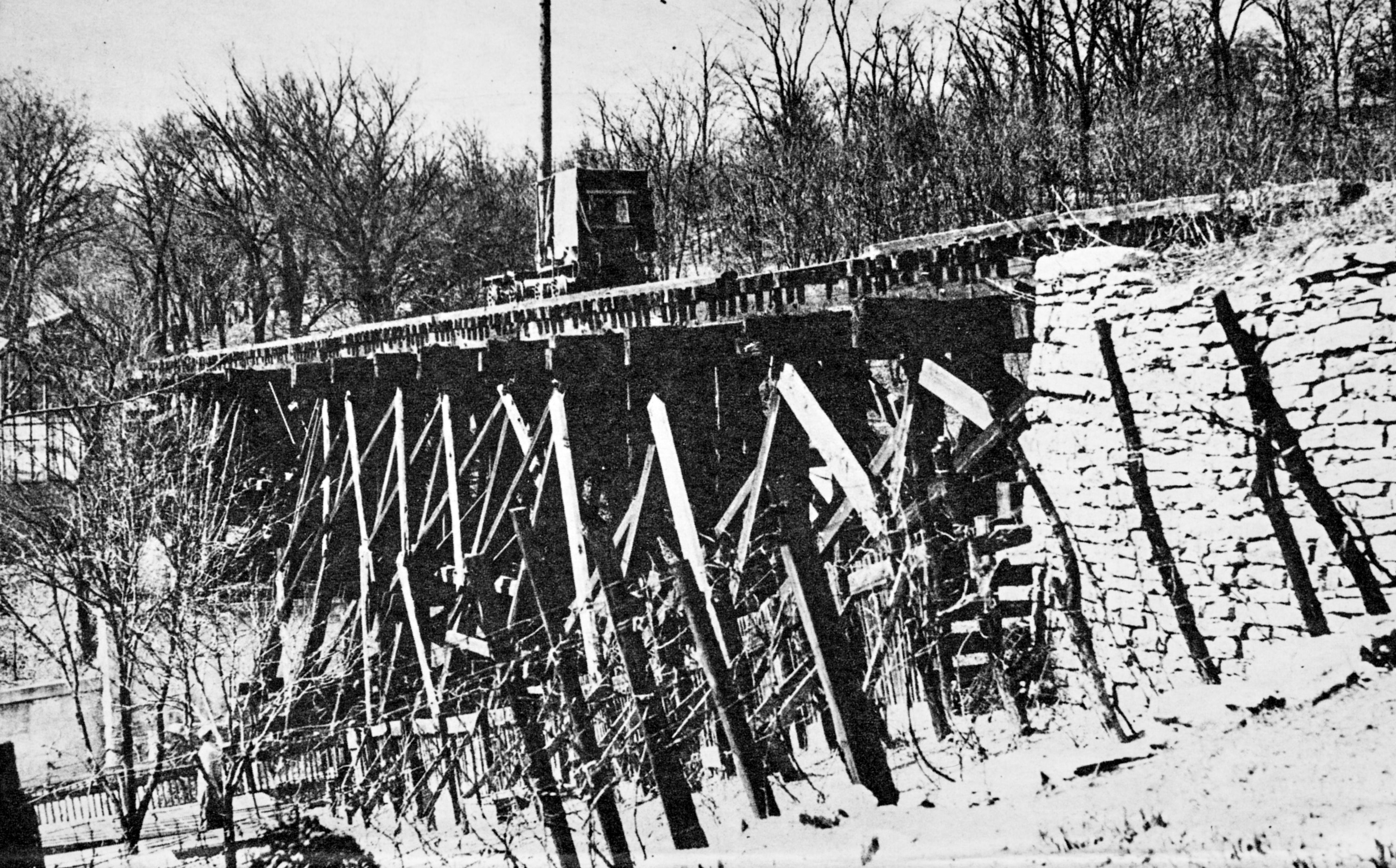 Historic photo of the Cincinnati & Westwood trestle over White Street, looking west. Note the concrete retaining wall at the bottom left that remains today, as well as the stone abutment at the right, of which about half remains today. A gasoline powered railcar is crossing the trestle, which was the only functioning rolling stock of the railroad in its last decades. This car was used for inspections and repair trips, and to maintain the railroad's status as operational. From "On the Right Track: Some Historic Cincinnati Railroads" by John H. White, Jr., Cincinnati Enquirer photo.