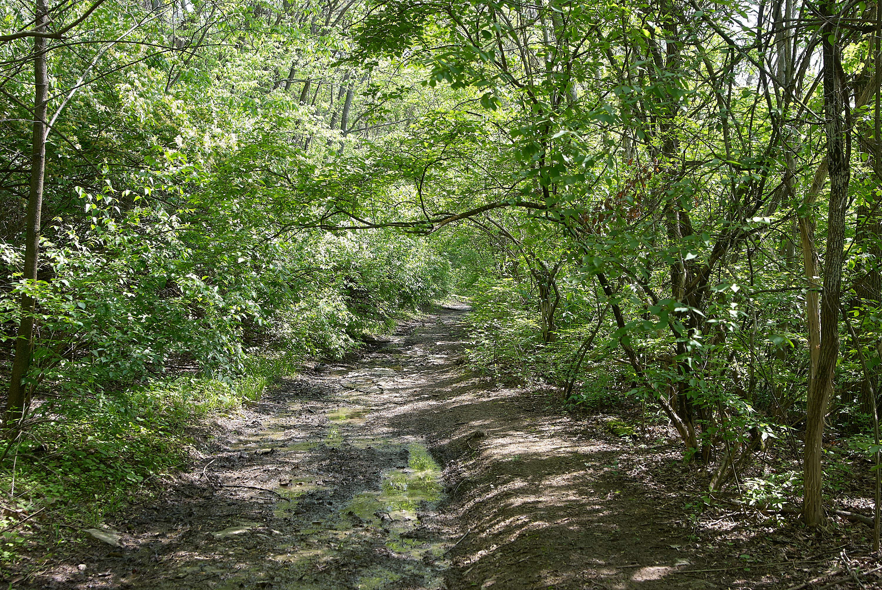 A typical view of the Cincinnati & Westwood right-of-way between South Fairmount and Westwood, looking east. The whole roadbed was pretty wet, but I was surprised that there have been few, if any, landslides along the roadbed.