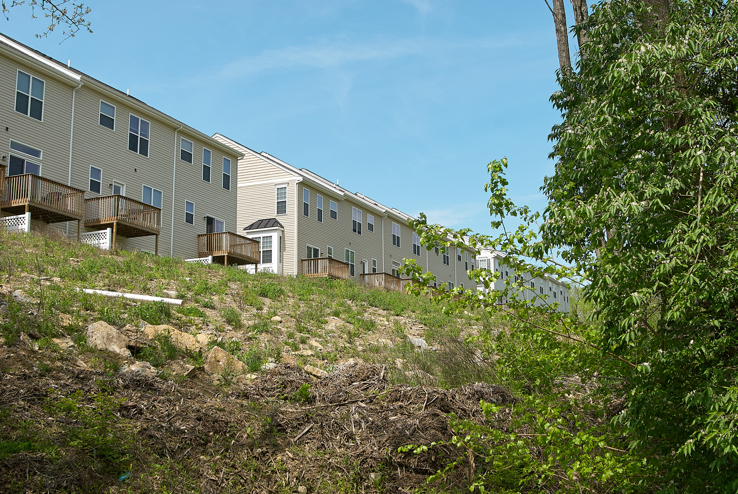 Cincinnati & Westwood right-of-way at the Bluffs at Woodcrest subdivision, looking north. The development has erased the roadbed, but thankfully not all the bridge piers. The westernmost abutment for the creek span was in the lower center, perhaps demolished as part of the housing development, or demolished earlier.