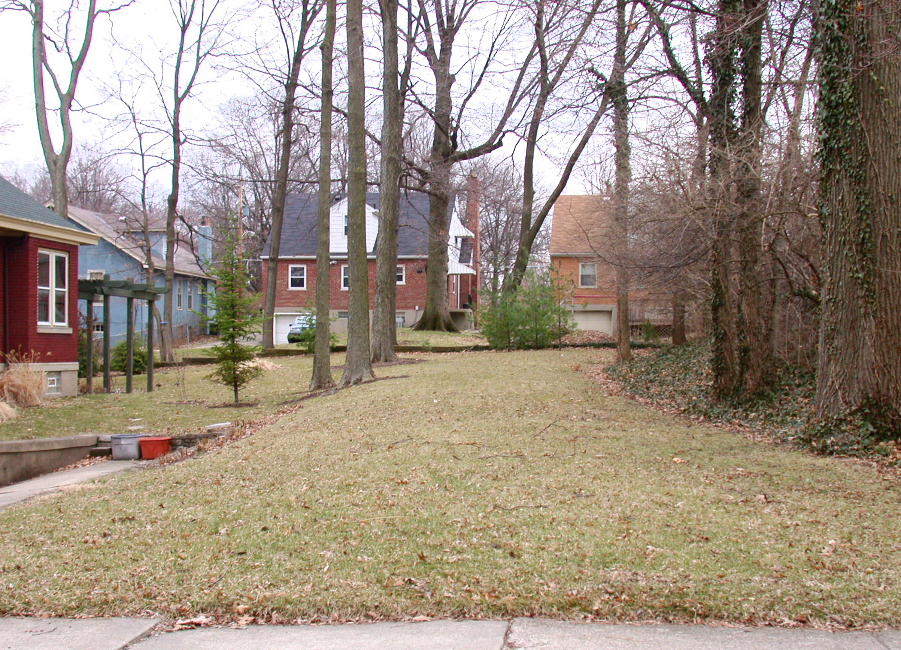 Cincinnati & Westwood right-of-way, looking southeast from McKinley Avenue in Westwood. Note that the two houses in the distance appar to be from the 1940's or 50's, after the line was scrapped, while the two on the far left are older, probably from the 1910's or 20's.