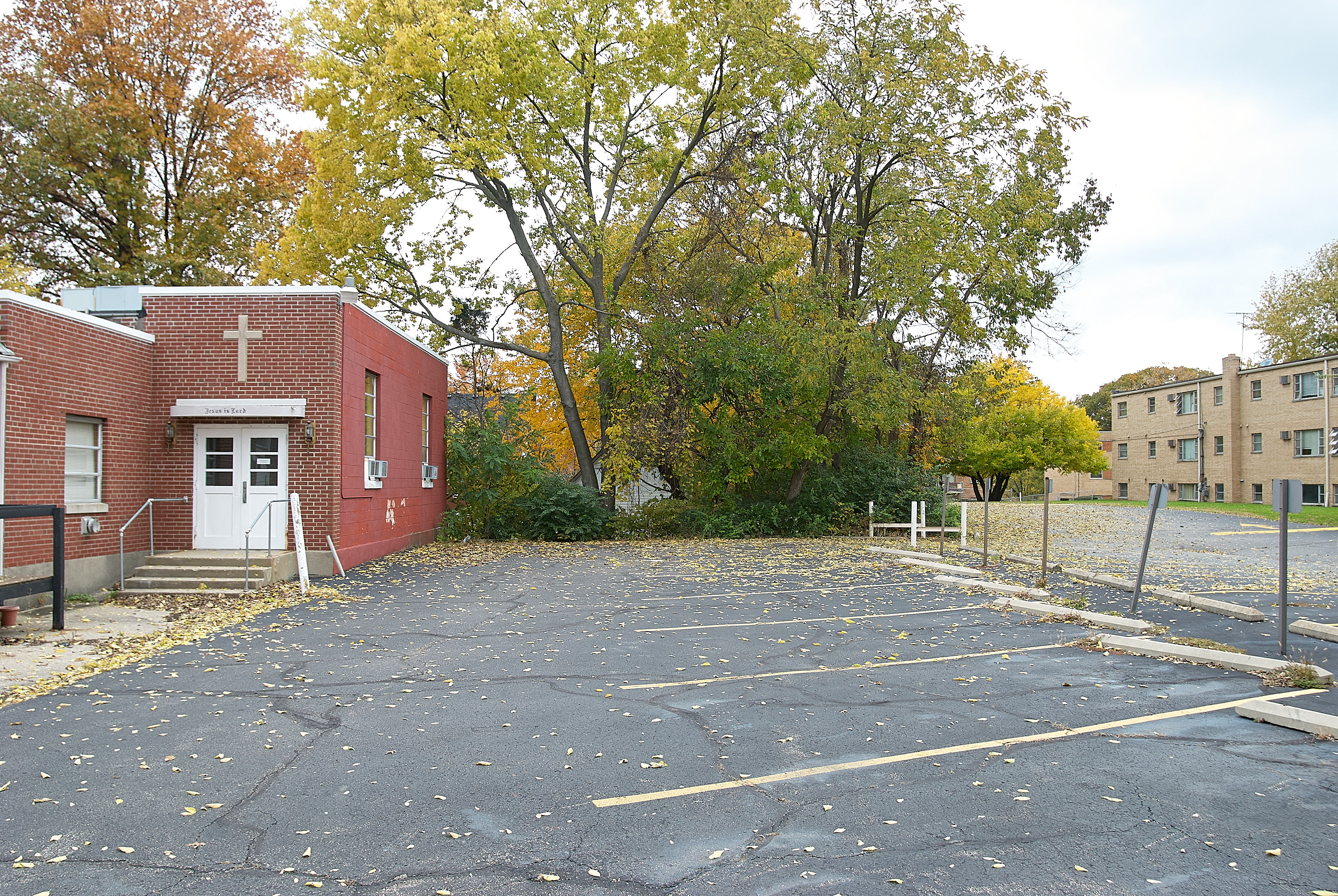 Cincinnati & Westwood right-of-way behind the yellow brick building from the last photo, looking west. The railroad ran in a shallow cut here, but it has been filled for this parking lot.