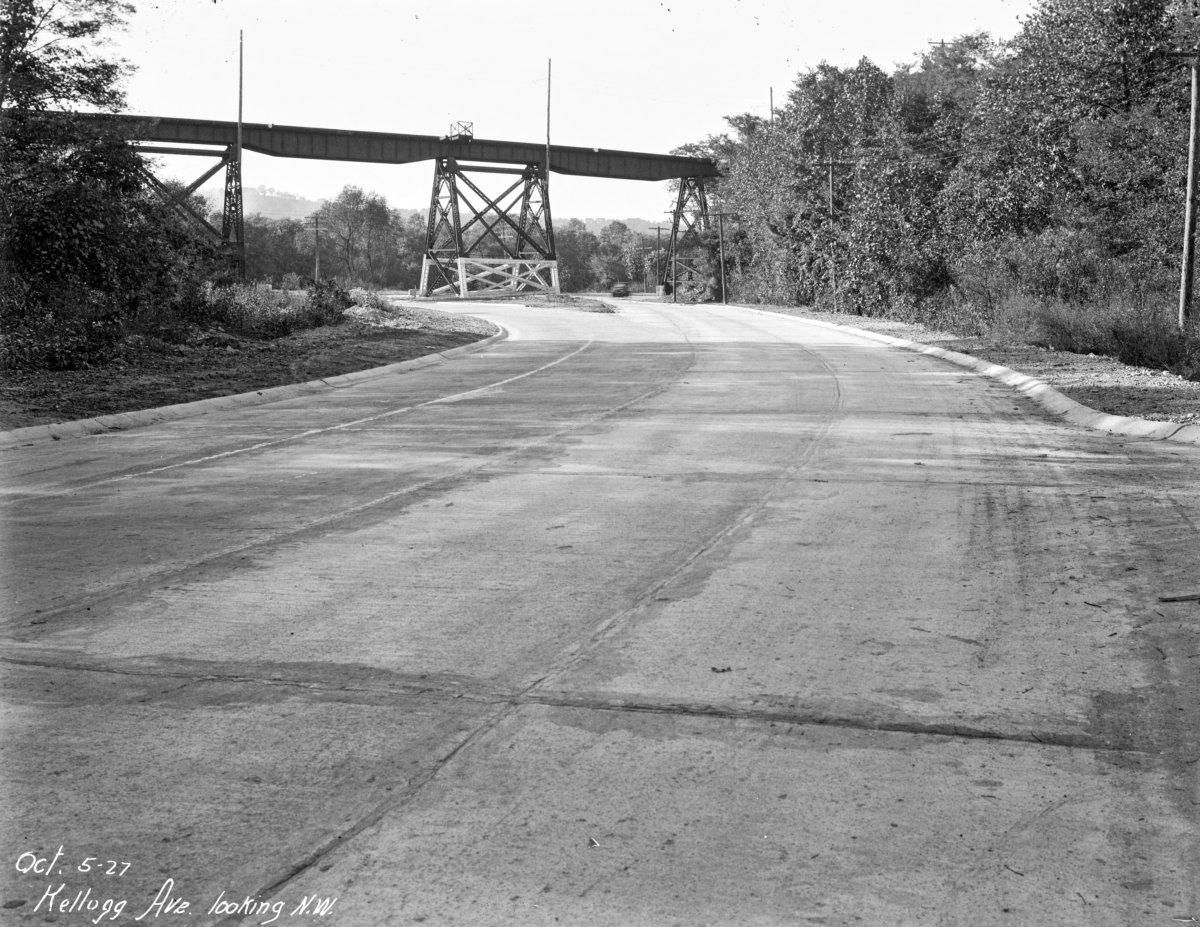 Historic photo of the CG&P Lick Run trestle over Kellogg Avenue, looking northwest from the entrance to California Woods Preserve after repaving. From the University of Cincinnati Library Digital Resource Commons, Street Construction and Improvements collection.