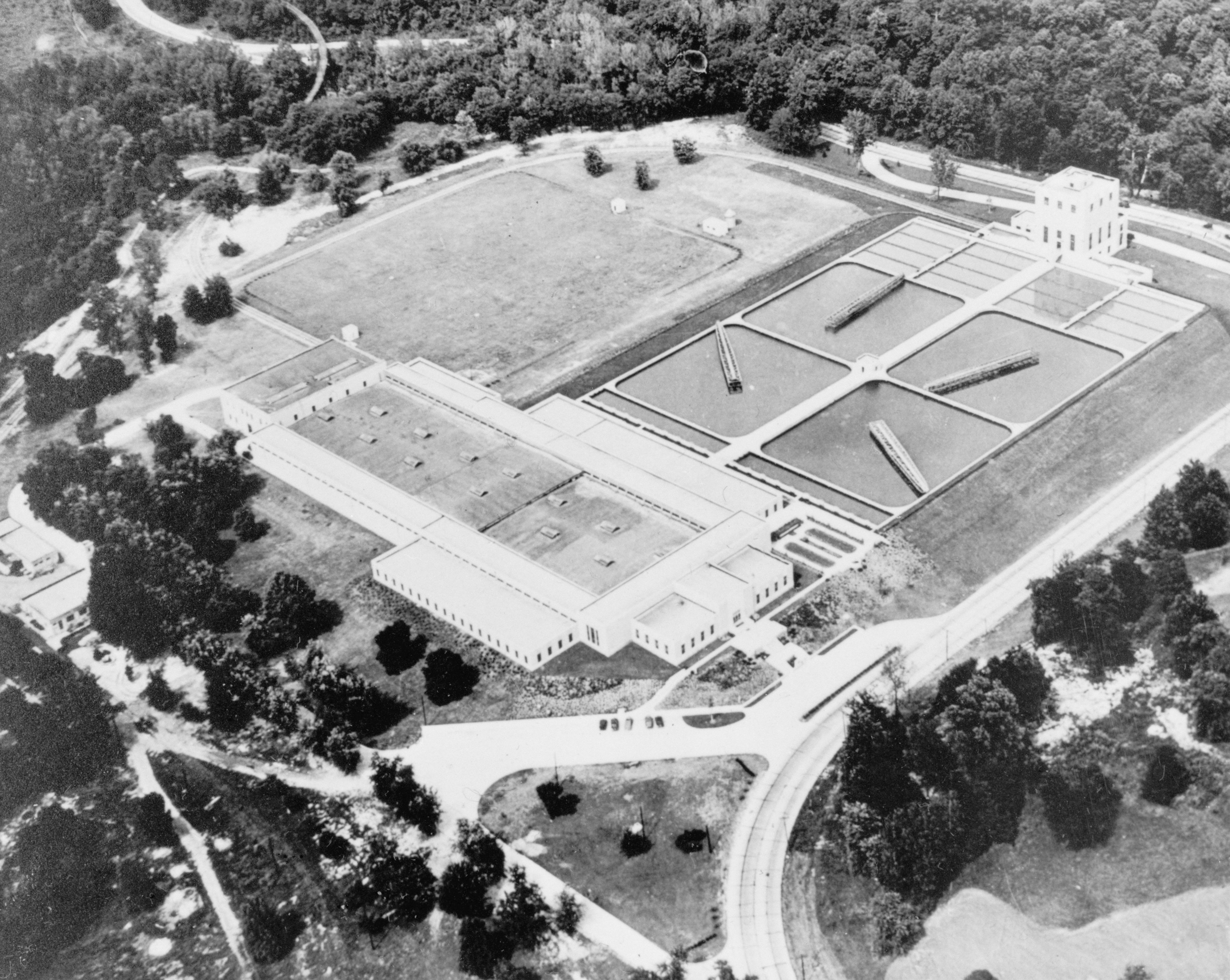 Historic aerial of the Cincinnati Water Works in California in 1939, looking north. Notice the Lick Run trestle crossing Kellogg Avenue at the top left. Remnants of the CG&P tracks to California and Coney Island beyond are barely visible at the bottom left.