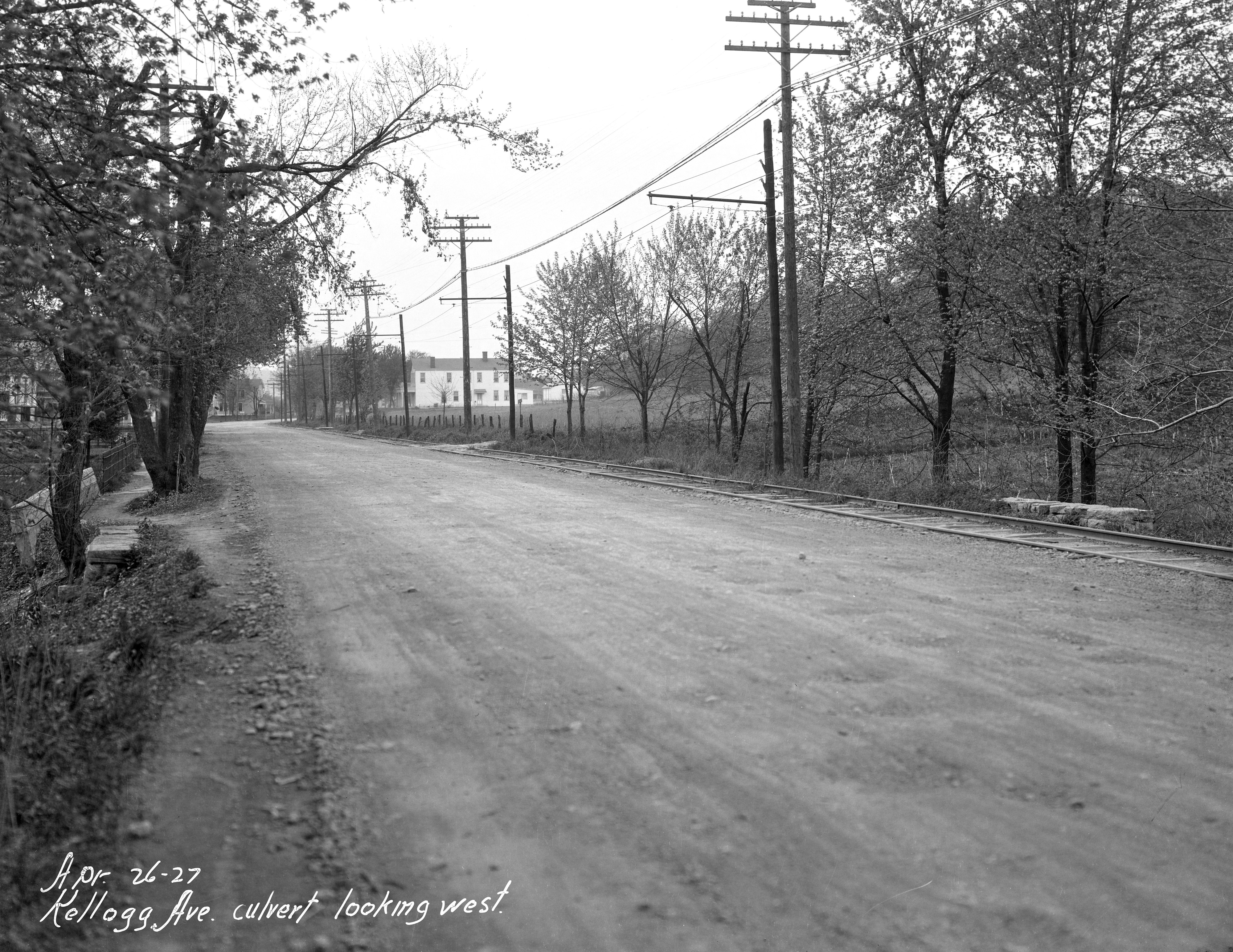 Historic photo of CG&P tracks from 1925 on Kellogg Avenue at Two Mile near Coney Island, looking northwest just three months before abandonment of the California branch east of the waterworks. The California branch was rerouted in 1925 to provide better access to the new racetrack and the main entrance of Coney Island. From the University of Cincinnati Library Digital Resource Commons, Street Construction and Improvements collection.