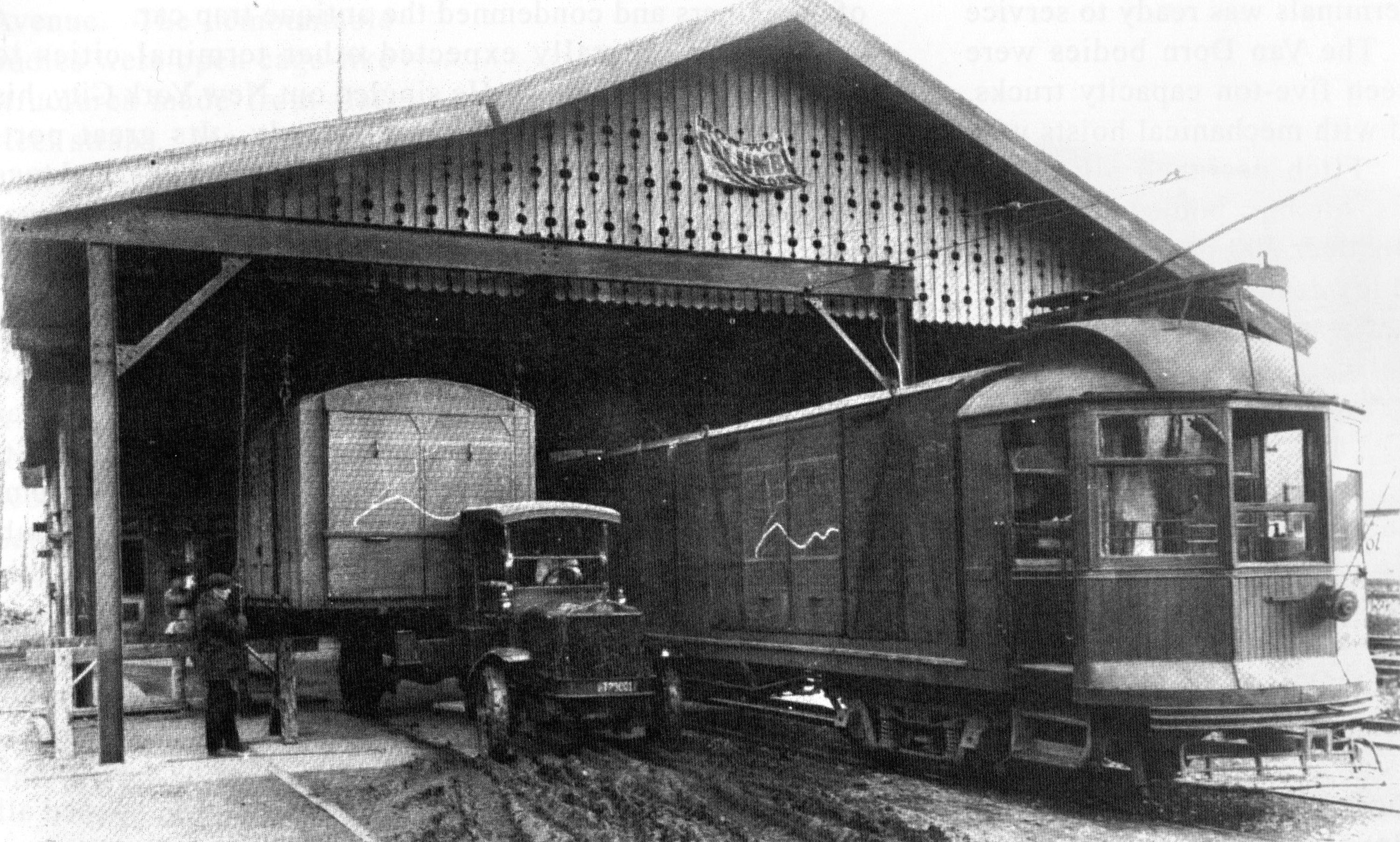 Historic photo of the CL&A terminal at Anderson Ferry Road in approximately 1921, showing Cincinnati Motor Terminals trailers being hoisted onto a truck, and a modified car which could haul two such trailers. This was a second-hand car purchased from the Chicago & West Towns Railway after the 1915 power house explosion and carban fire. After new lightweight cars were purchased in 1918 this one was modified to remove the center section, leaving room for two Cincinnati Motor Terminals trailers, while the motorman's cabs on each end remained enclosed for protection from the weather. From "On the Right Track: Some Historic Cincinnati Railroads" by John H. White, Jr.