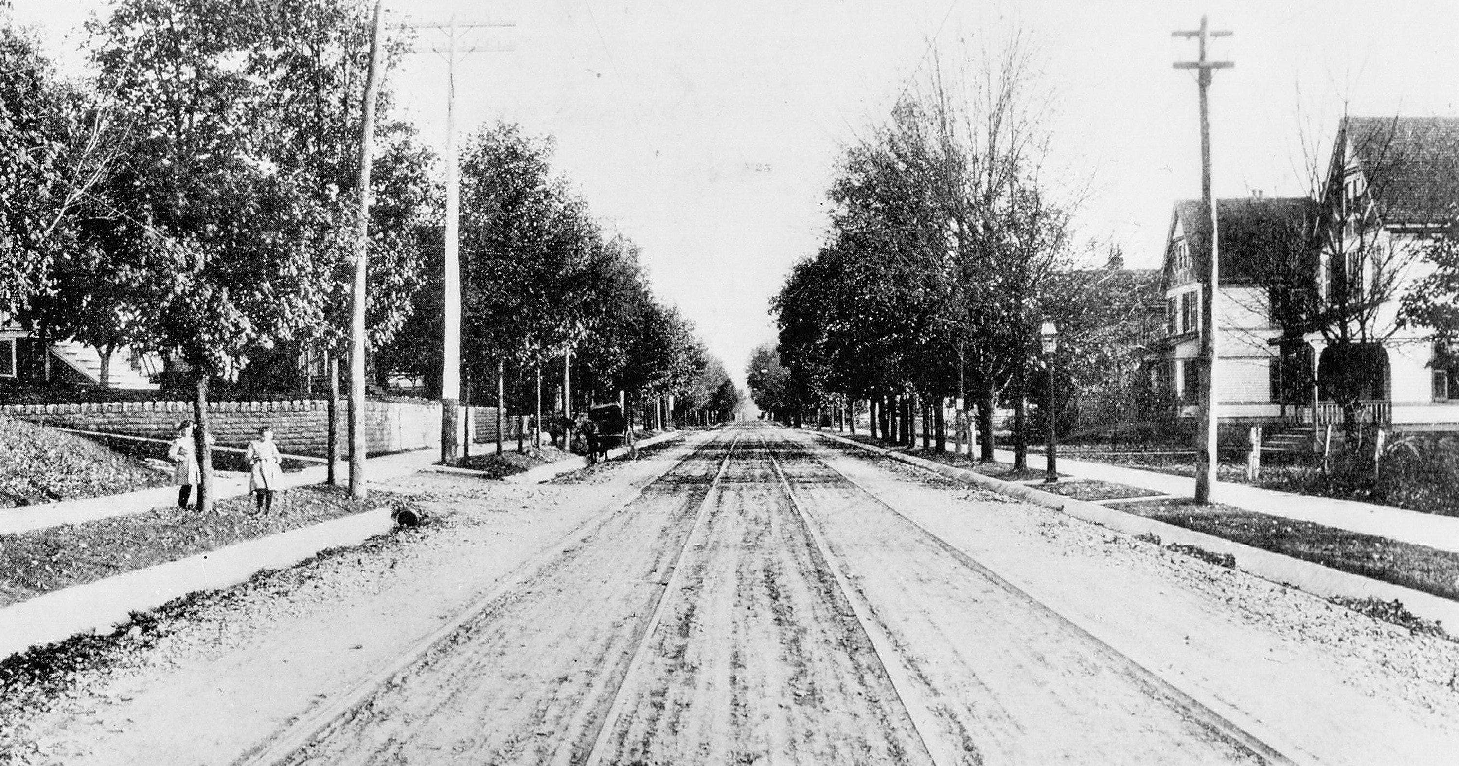 Historic photo of CL&A tracks on Gracely Drive at Cherokee Avenue, looking southeast. The stone retaining wall at the left and the houses on the right remain today. From "Along the Line," a promotional booklet published by the CL&A, provided by Bill Van Doren.