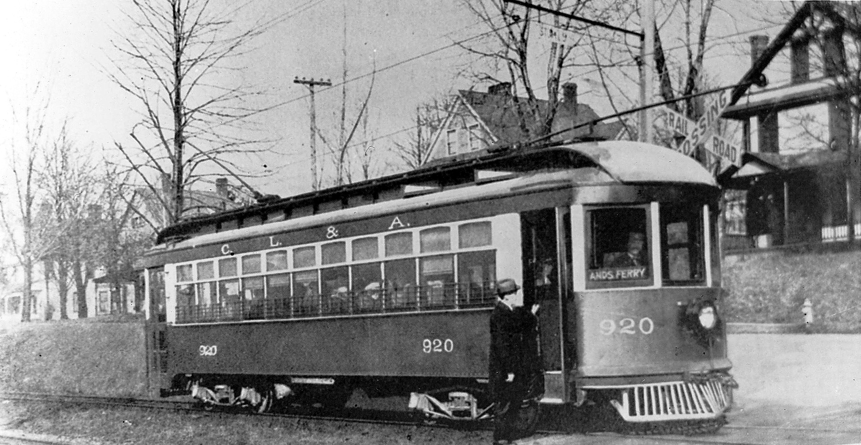 Historic photo of CL&A car 920 at Wilkens Short Road in 1930. A single rail of the Big Four is at the extreme bottom left. The houses which remain today on River Road were originally on Nokomis Avenue. When the CL&A removed its tracks from Gracely Drive to this private right-of-way, they wedged them into the small strip of land between Nokomis and the Big Four. From the Cliff Scholes collection, provided by Bill Van Doren.