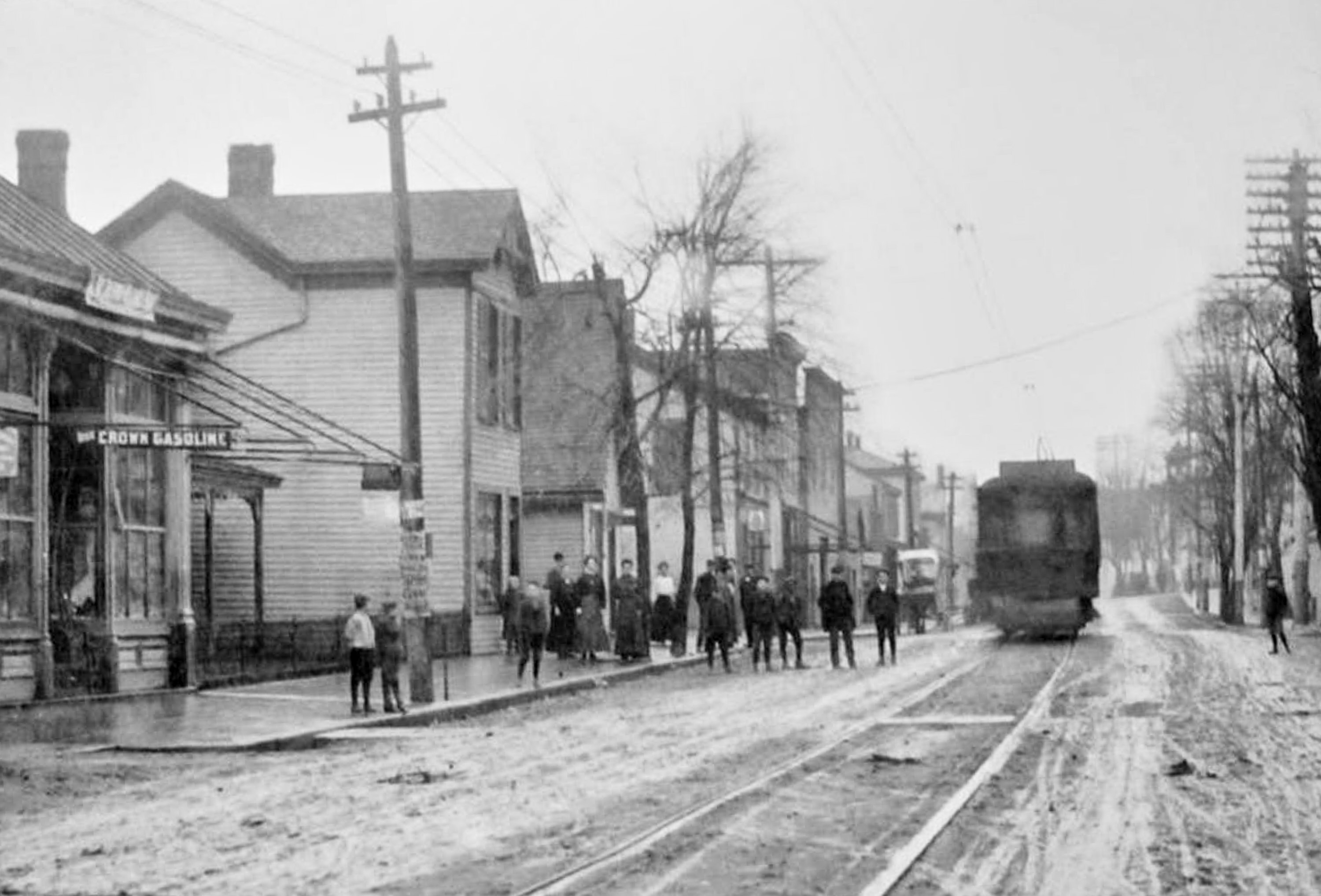 Historic photo of a CL&A car on Miami Avenue in Cleves, looking north probably from Mulbury Street in 1906.