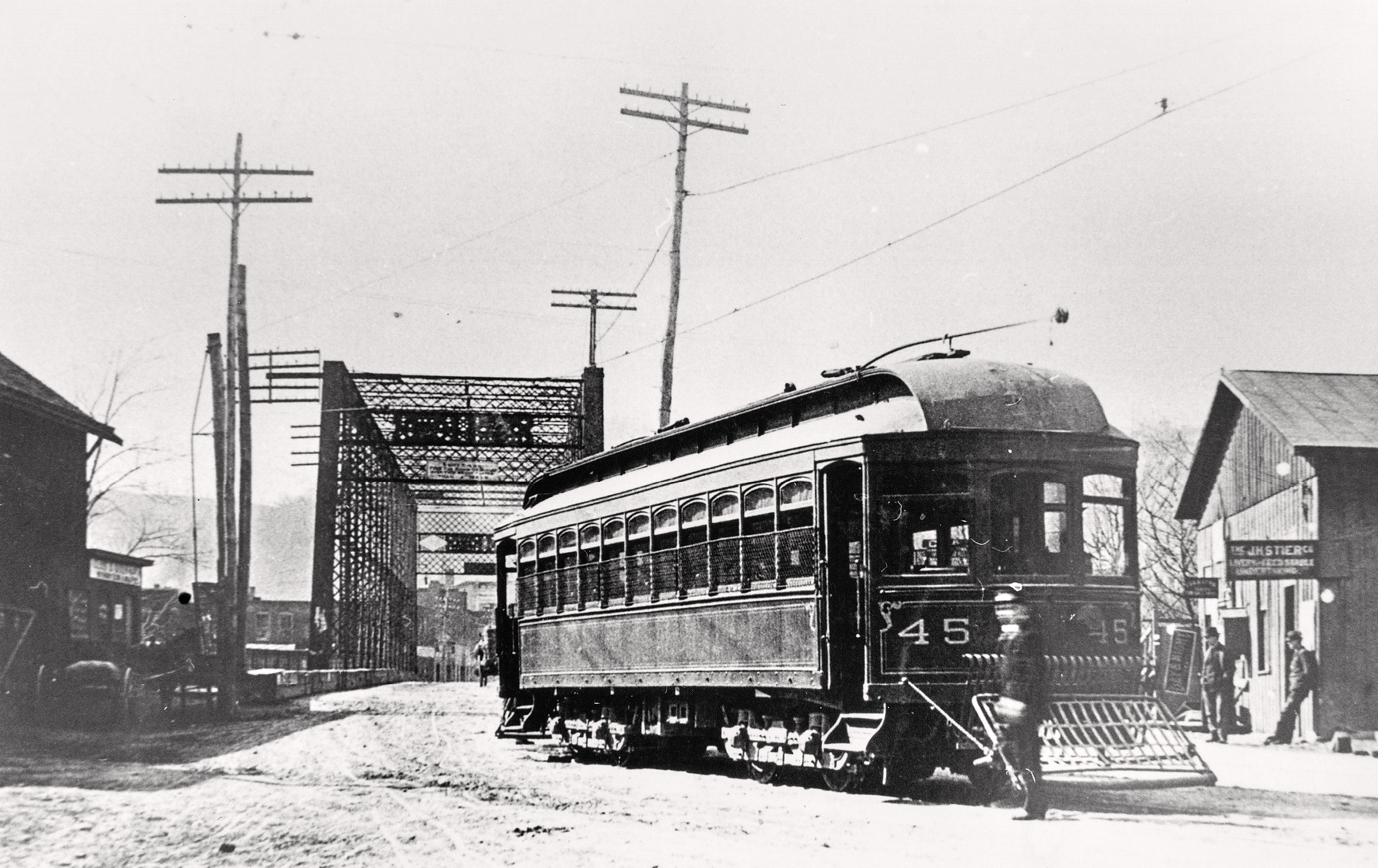 Historic photo of a CL&A car at the end of the line on George Street in Aurora, looking south towards the bridge over Hogan Creek.