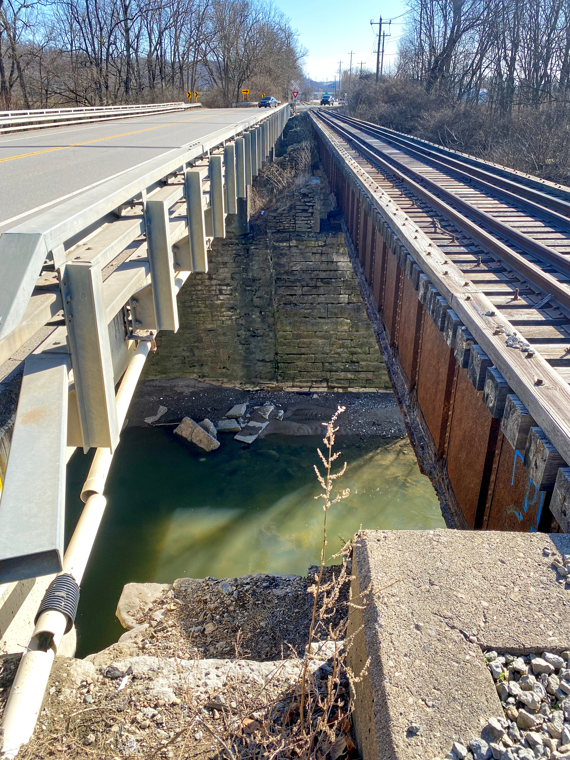 Standing on the location of the CL&A bridge over Dry Fork Creek, looking south. The joint between the original aqueduct support on the left and the slightly newer railroad pier is clearly visible at the center. The haphazard piles of stone on top between the road deck and railroad girder are likely for the CL&A truss bridge.