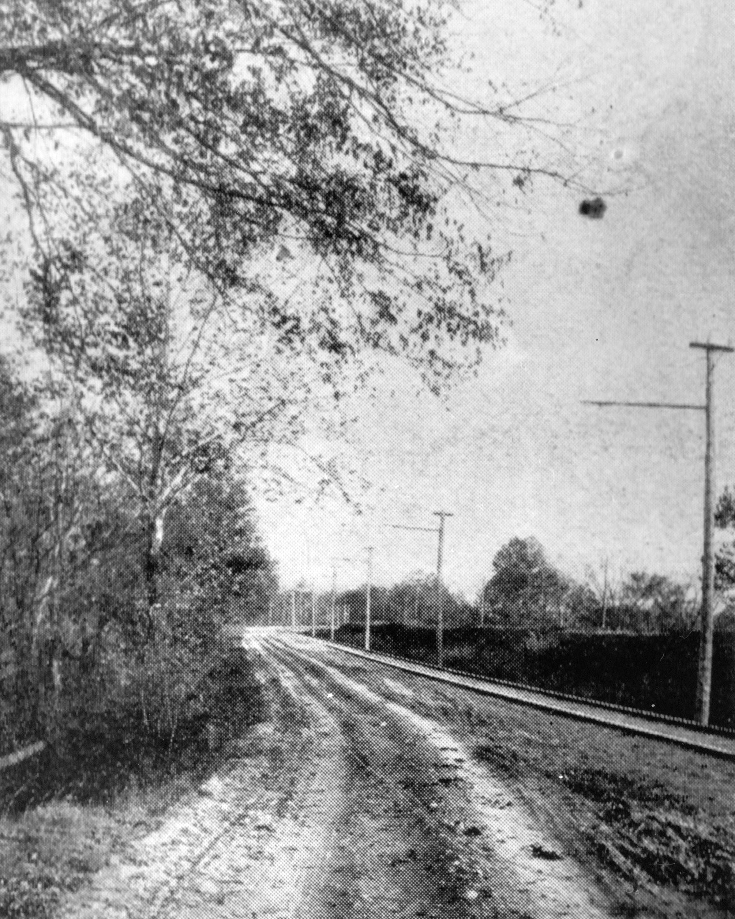 Historic photo of the CL&A captioned "One of a thousand gems along the old Whitewater Canal. Stop No. 124." Due to the curvy nature of the street and the high embankment for the Big Four railroad behind the CL&A, this should be along Campbell Road between Featherwood Drive and the state line, looking southeast. From "Along the Line," a promotional booklet published by the CL&A, provided by Bill Van Doren.