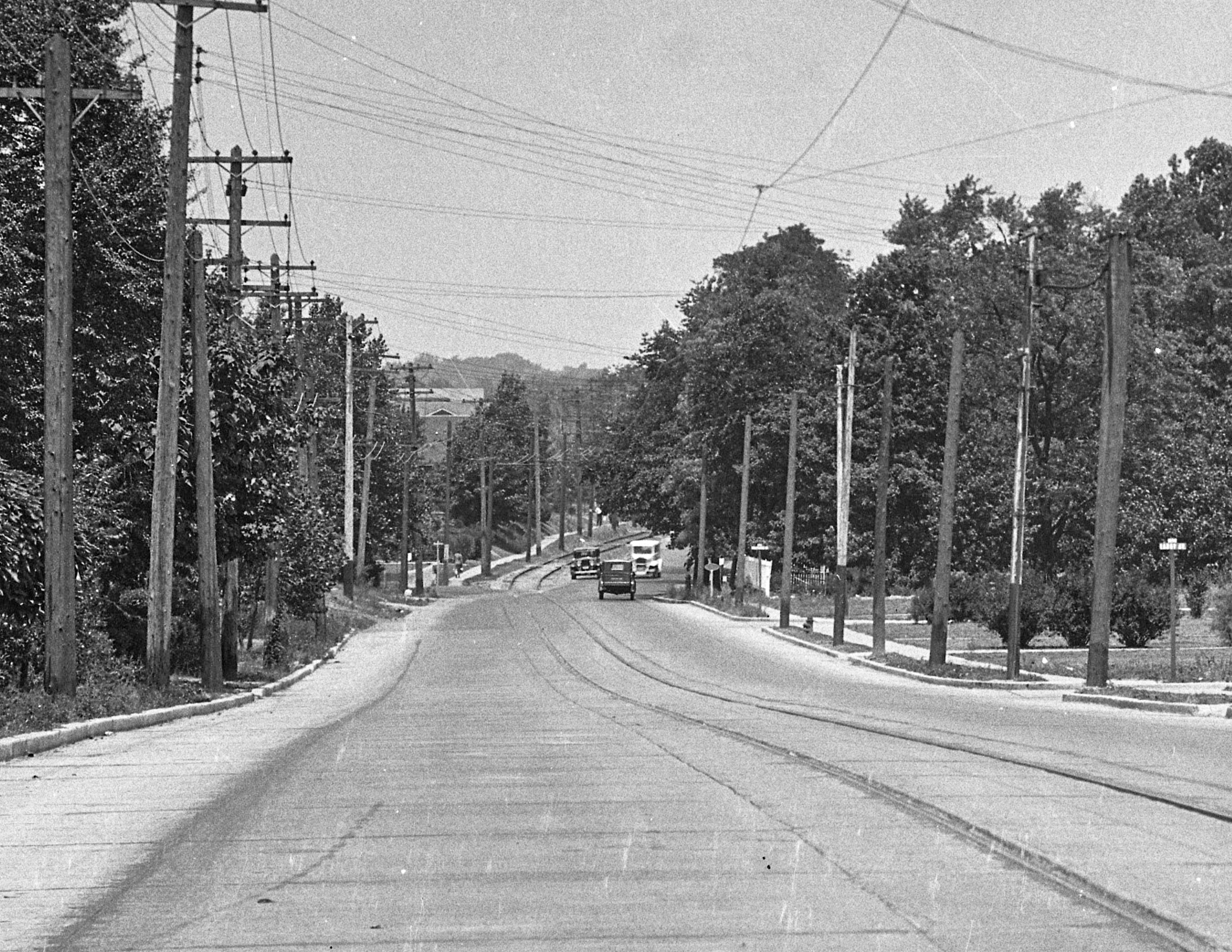 Close-up of the previous photo of C&LE tracks on Hamilton Avenue in College Hill after repaving, looking north. Note how in the distance the repaving work stopped and the tracks move back to the left side of the street. From the University of Cincinnati Library Digital Resource Commons, Street Construction and Improvements collection.