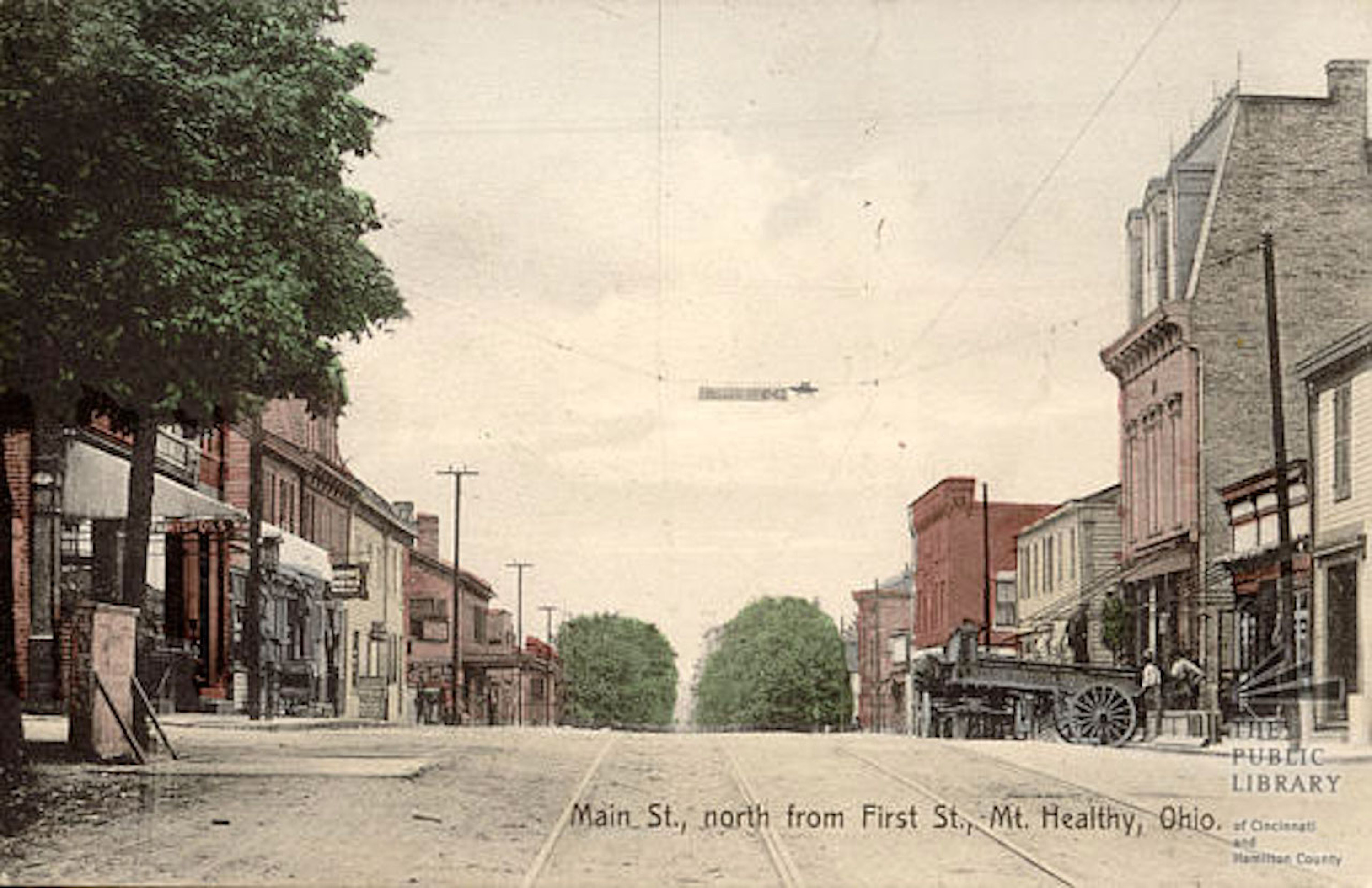 Historic view of the C&LE tracks on Hamilton Avenue between Kinney Avenue and Compton Road in Mt. Healthy, looking north. The dark red building on the right in the distance is at the far corner of Compton, directly across Hamilton from the building in the next postcard, which can barely be seen on the left before the trees start. Note that there are two tracks for the interurban here, as there was a passing siding here at the center of Mt. Healthy.