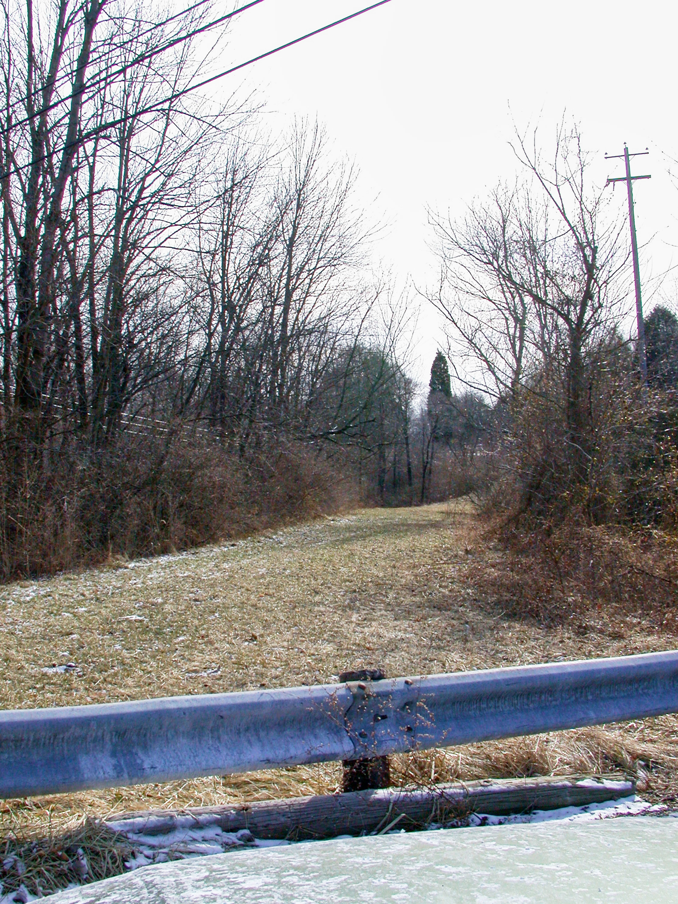 CM&B right-of-way approaching Marathon-Edenton Road in Edenton, looking southwest. The road has been realigned recently, and the route is not as obvious as it seems here.