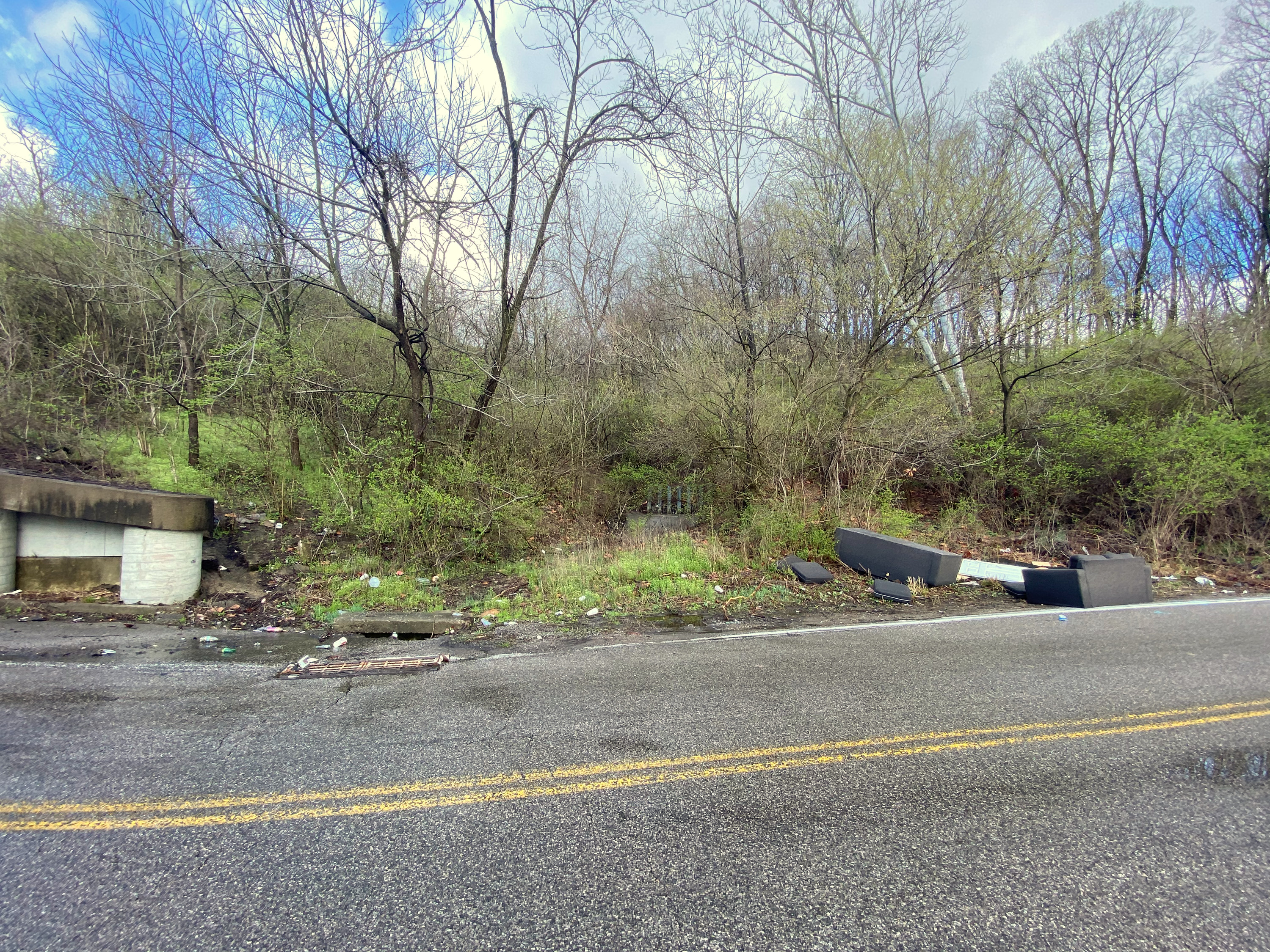 Approximate location of the Cincinnati Western crossing at Faraday Road, looking west. There's a small creek coming down the hill over top of the old tunnel and right-of-way, and a culvert inlet is visible at direct center in the woods. Fay Apartments is on the hill at the top.