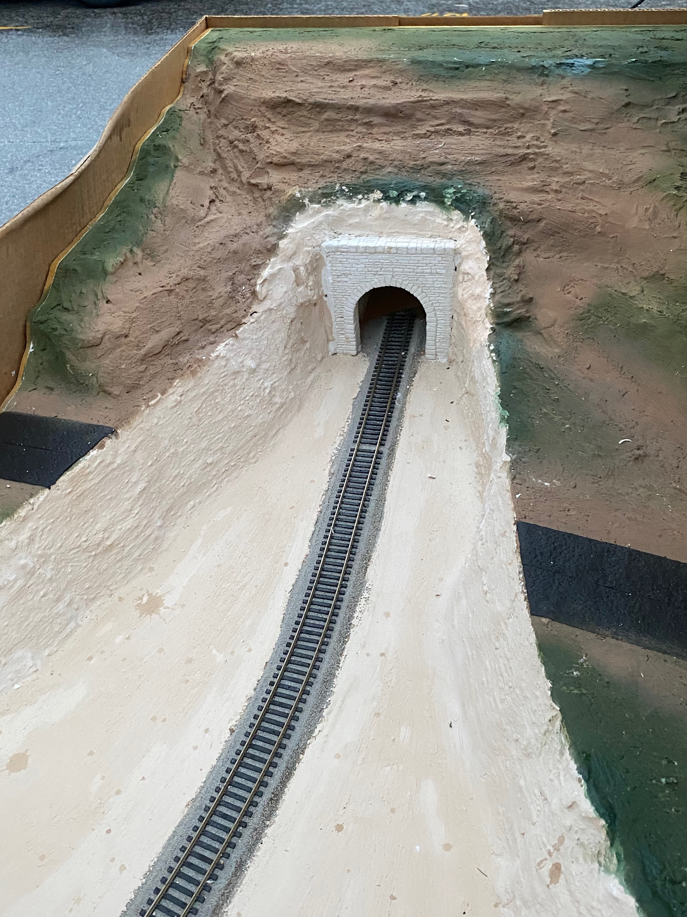Plaster model of the Cincinnati Western tunnel east portal and crossing at Faraday Road by Dave Pommert. Faraday Road is the black strip running from left to right, and it was temporarily rerouted when tunnel construction began. When finished, Faraday would have a bridge over the cut below. The tunnel portal is probably farther back in the hill than shown here.