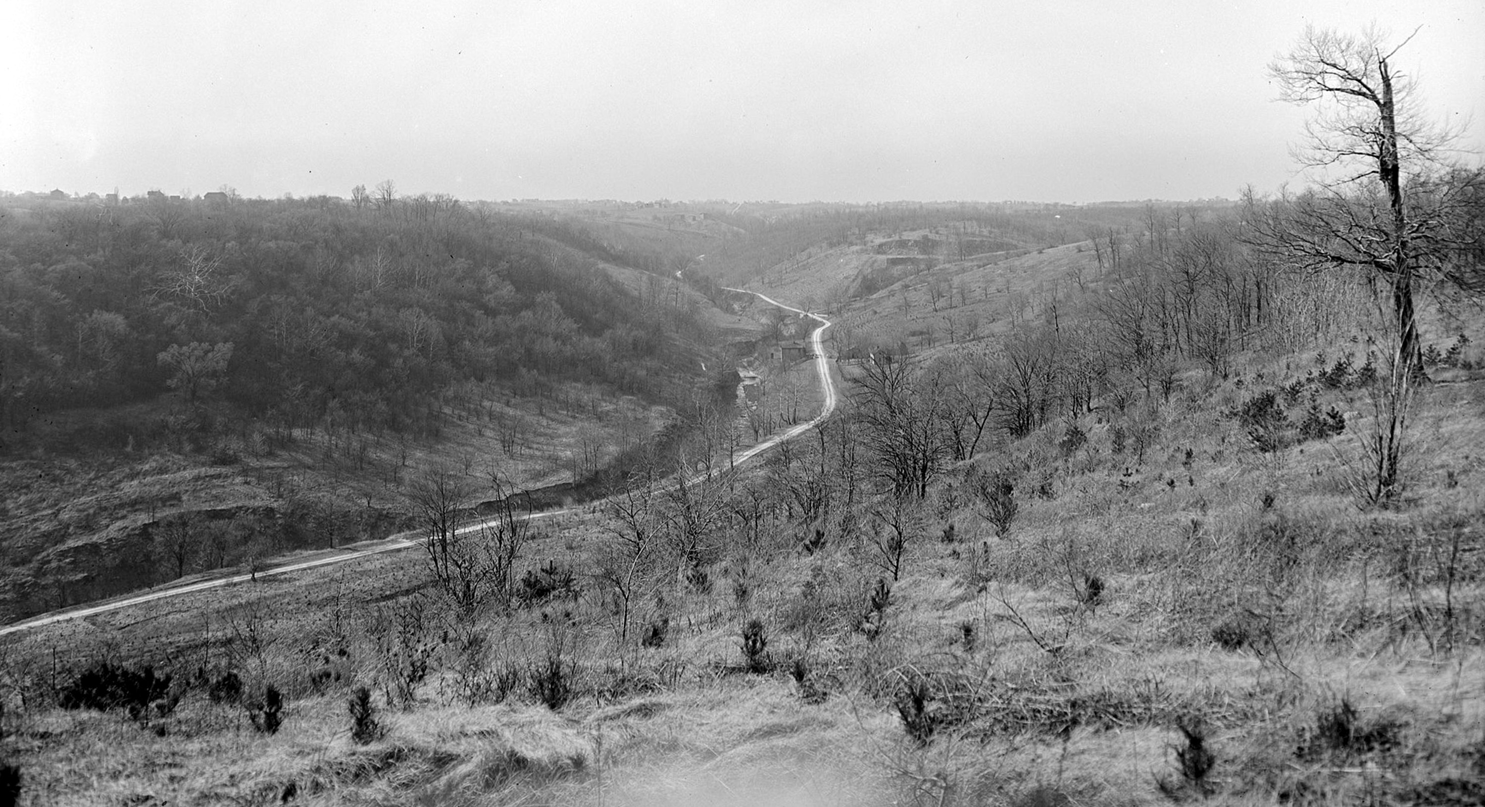 Historic photo of West Fork Road as seen from Mt. Airy Forest, looking northwest towards Shepherd Creek Road and Monfort Heights. The Cincinnati Western grading is about half way up the hill on the left.