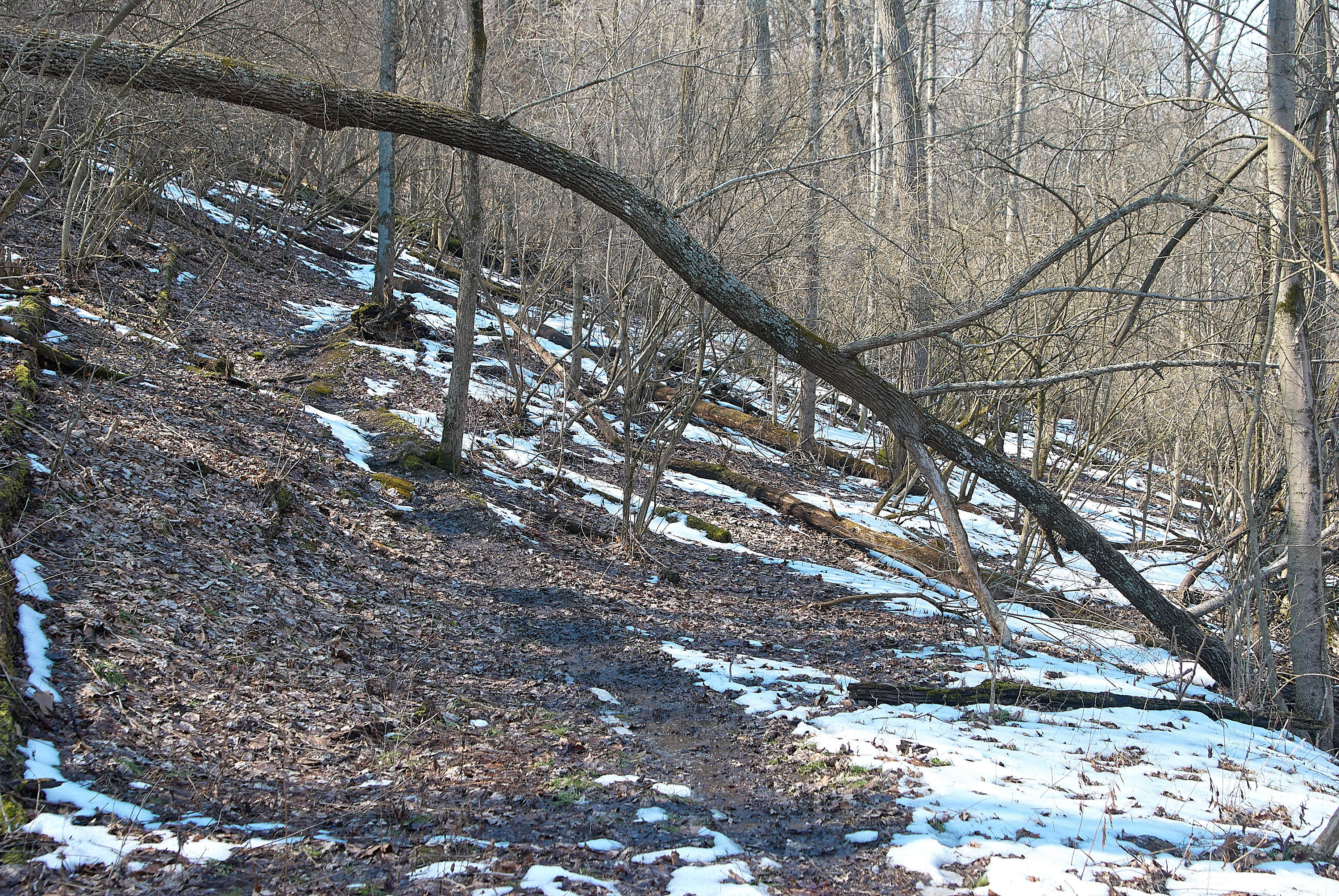 Cincinnati Western grading in Mt. Airy Forest, looking northwest at the location where grading ends. This is about 1/3 of the way between the West Fork Road bridge over the creek and Shepherd Creek Road.
