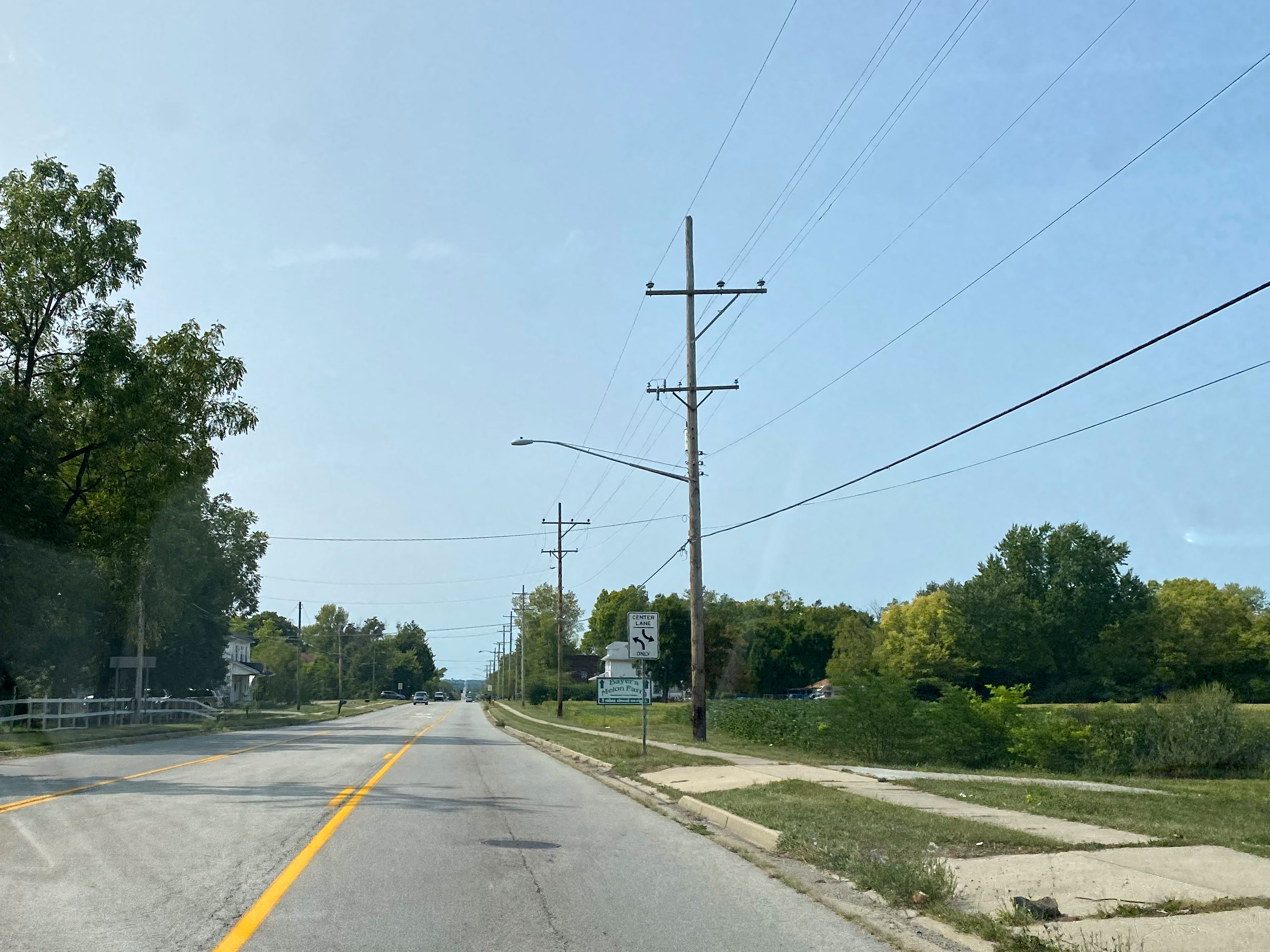 A typical view of the Dayton & Western route west of Dayton on US-35, looking west from near Bricker Avenue. For the most part the D&W ran to the right side of the street, where the power lines are today.