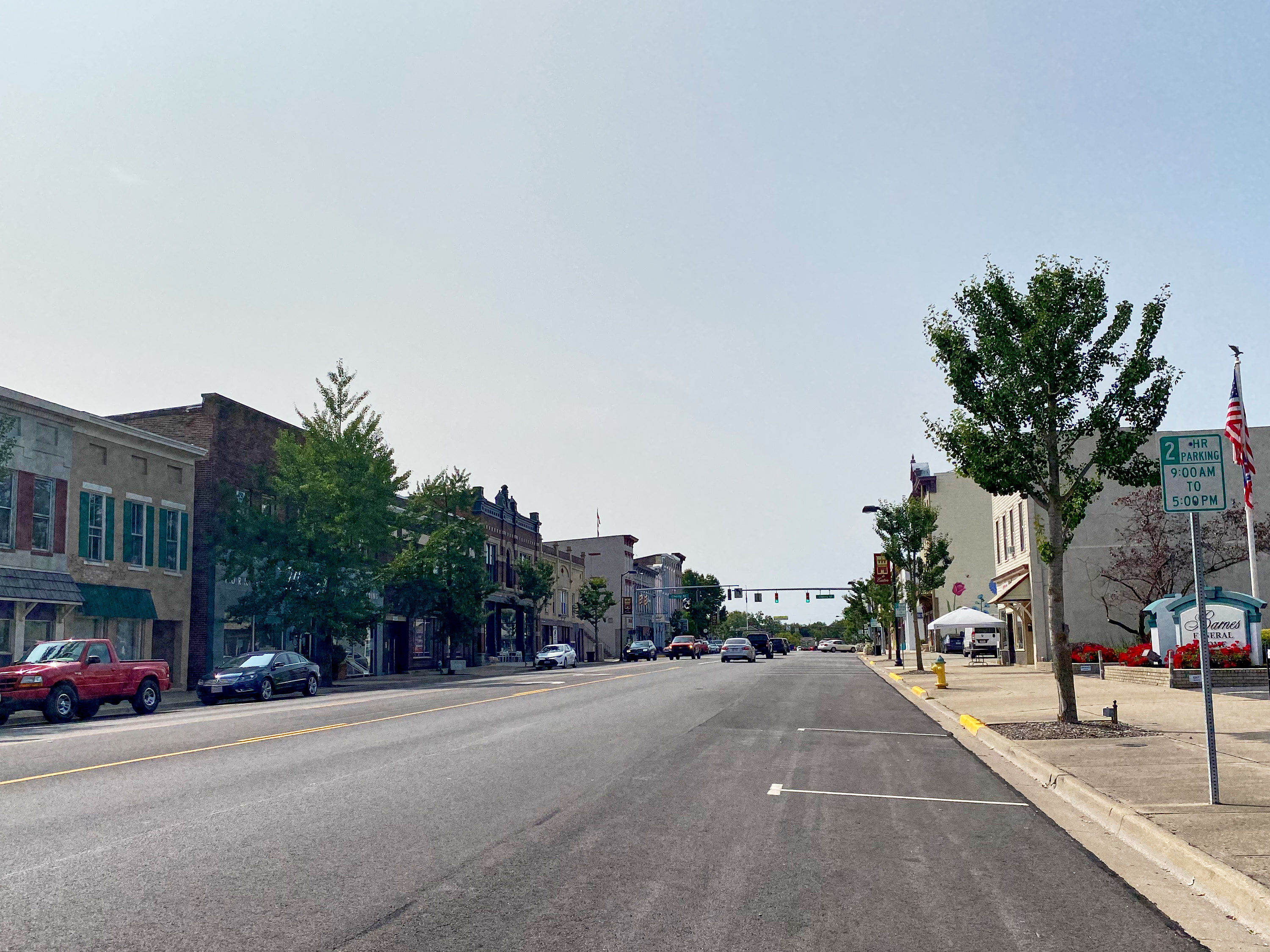 Dayton & Western route on Main Street in Eaton, looking west from near Maple Street and the location of the depot. There was a passing siding at this location as well.
