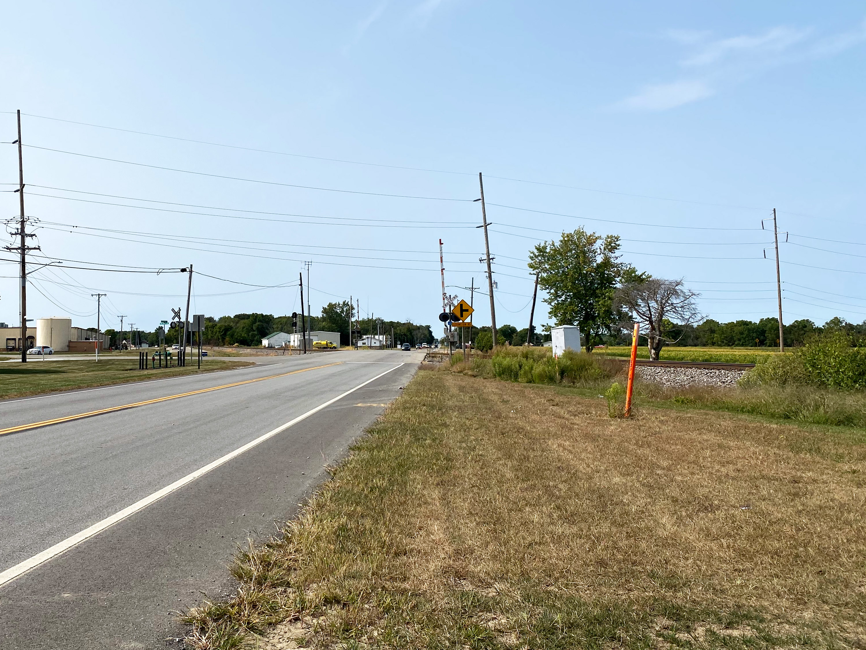 Current location of the Dayton & Western Ohio Viaduct, looking northwest along US-35 at Lexington Road and the former Pennsylvania Railroad's Richmond Division tracks, now Norfolk Southern. The grass in the middle of the photo would be directly under the viaduct. There don't appear to be any remnants of it today.