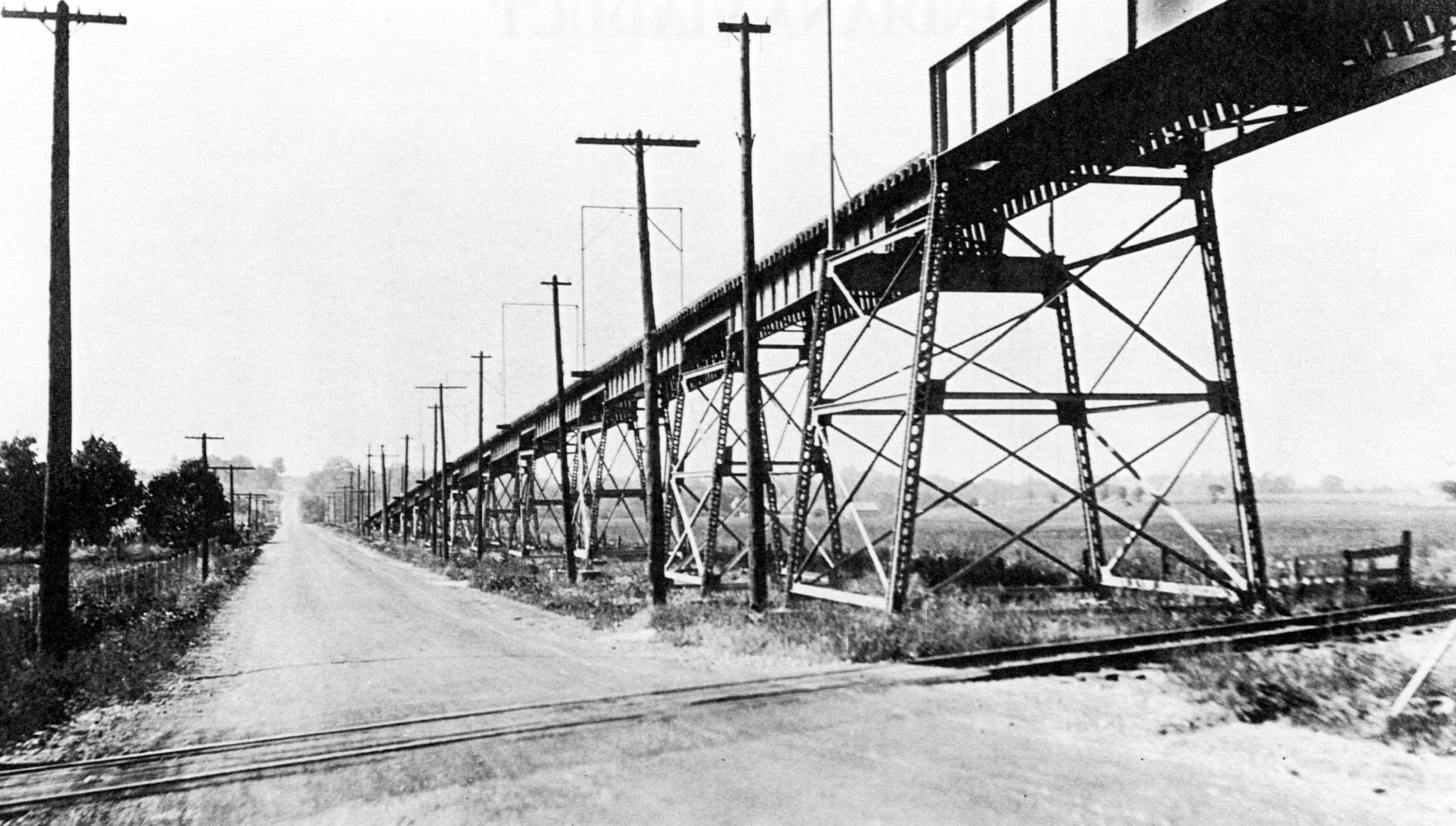 Historic photo of the Dayton & Western Indiana Viaduct crossing the former Pennsylvania Railroad's Richmond Division tracks, now Norfolk Southern, looking west down Roby Lane from approximately the same vantage point of the previous photo. From The Dayton & Western Traction Company by Scott D. Trostel