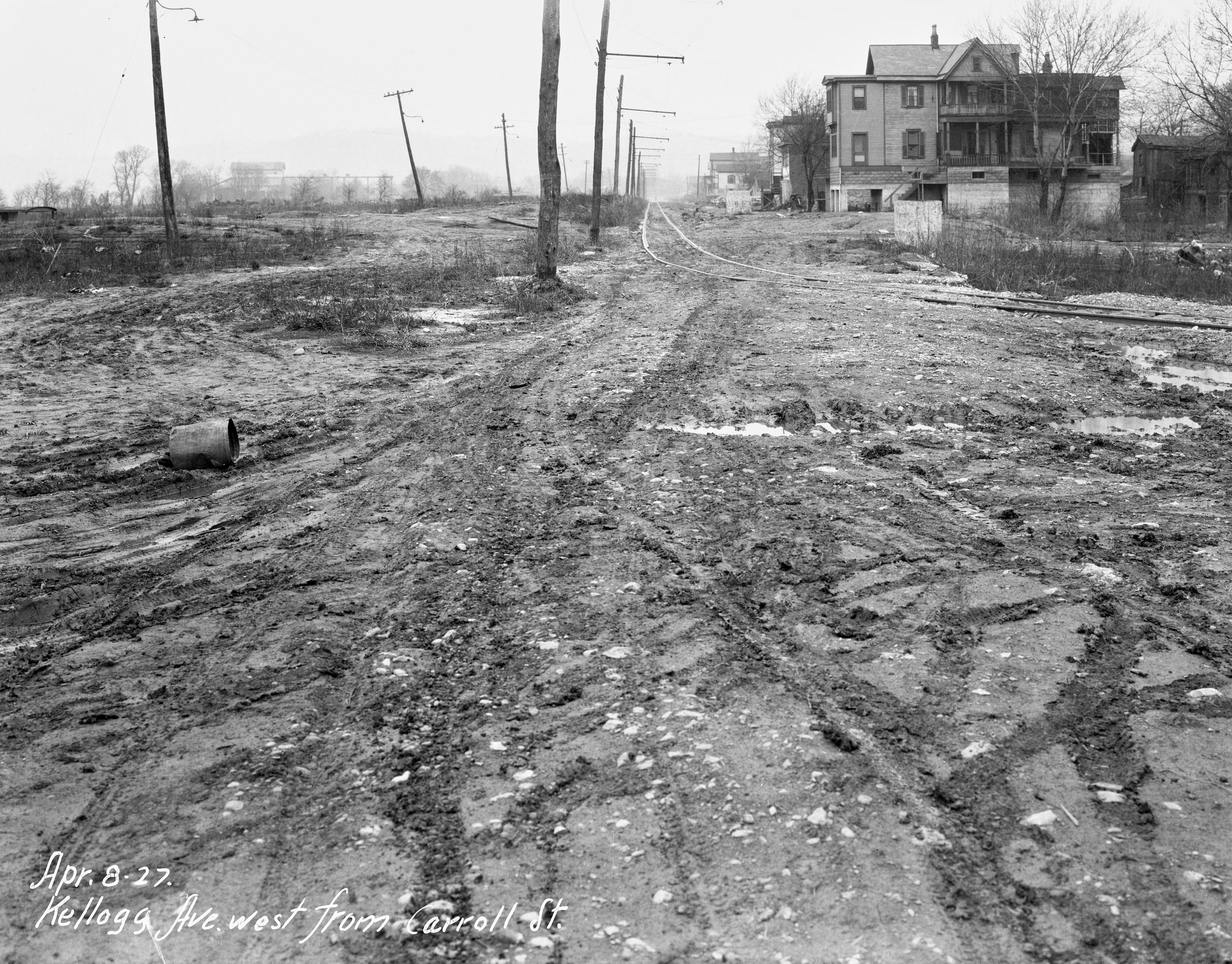 Historic photo of the CG&P on Kellogg Avenue in Columbia-Tusculum, looking northwest from Carrel Street. It appears that Carrel is just to this side of the house at the top right. The CG&P appears to have built a new track to Kellogg south of Carrel since the track in the middle of the street was likely removed in 1922 with the rest of the IR&T. Similar to previous photos is what appears to be another right-of-way to the left of the tracks. Note the electric poles and street lights. The right-of-way for Kellogg was always rather wide, so it might be the case that the original road and the double tracks from the IR&T were between the two lines of electric poles. The way each row leans out is typical where span wires were used to suspend dual trolley wires. That said, the current street still only takes up about half of this width. The far left pole line would be well into private property today. Regardless, after the IR&T was abandoned the CG&P was able to assume their franchise agreement to use the street, but the tracks had already been removed and they had to build their own on a different alignment. These would then have to be moved again just three years later due to the street repaving. From the University of Cincinnati Library Digital Resource Commons, Street Construction and Improvements collection.