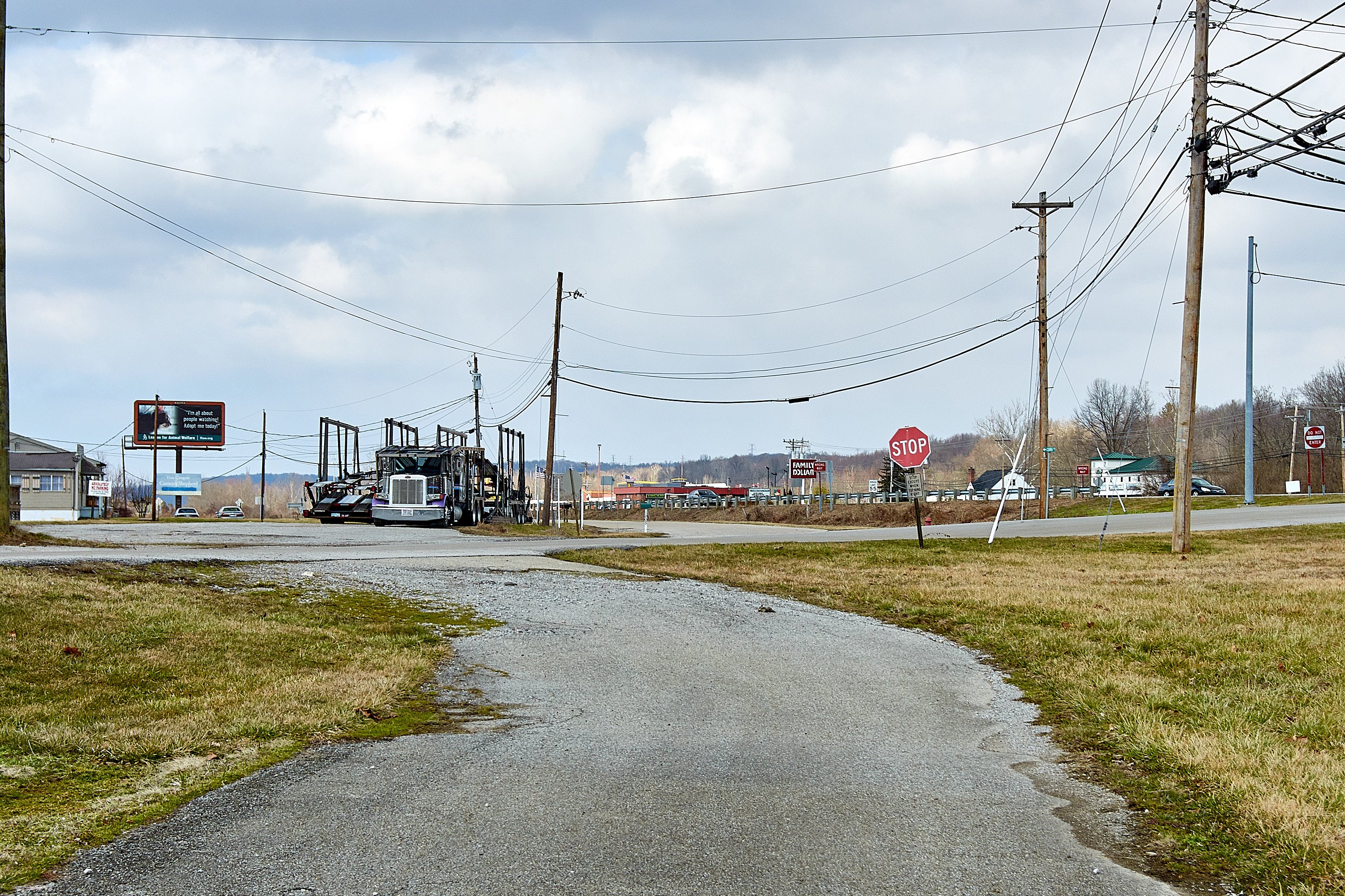 Cincinnati & Eastern New Richmond Branch route approaching Front Street in New Richmond at US-52, looking north. The Cincinnati & Eastern branch of the later Interurban Railway & Terminal also came in to town at this location as well, crossing more right to left while the New Richmond Branch came in more straight to the driveway at the bottom.