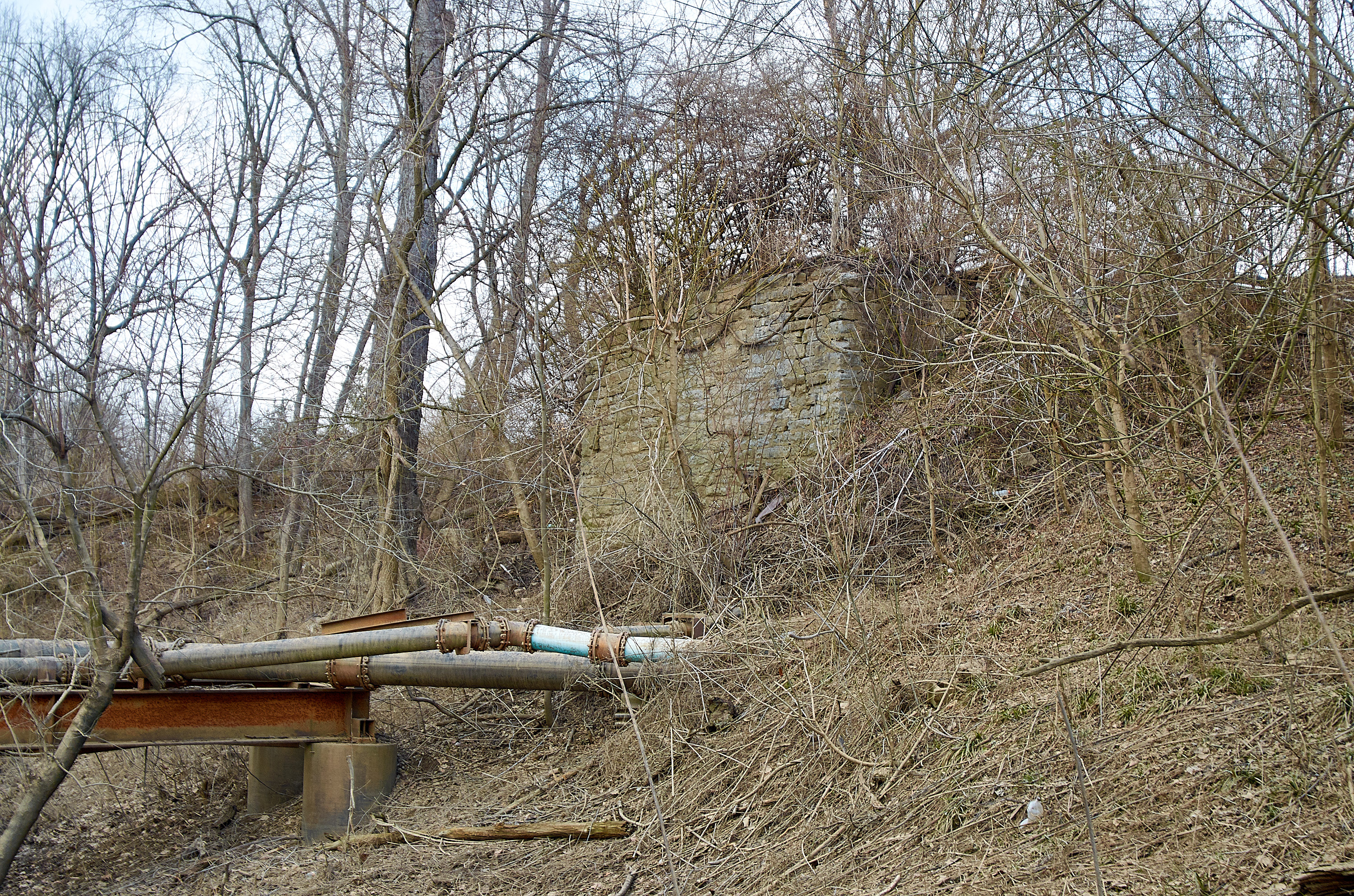 IR&T bridge abutment at Twelvemile Creek in New Richmond, looking north at the northern abutment from the bank of the creek.