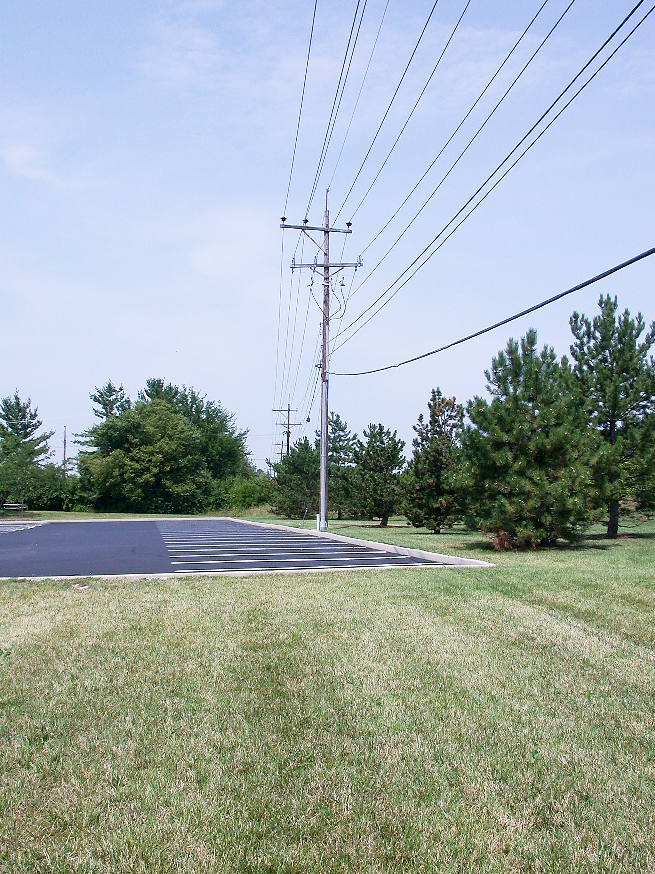 IR&T Rapid Railway right-of-way crossing a private parking lot at the end of Courseview Drive in a commercial park on the east side of Mason, looking west.