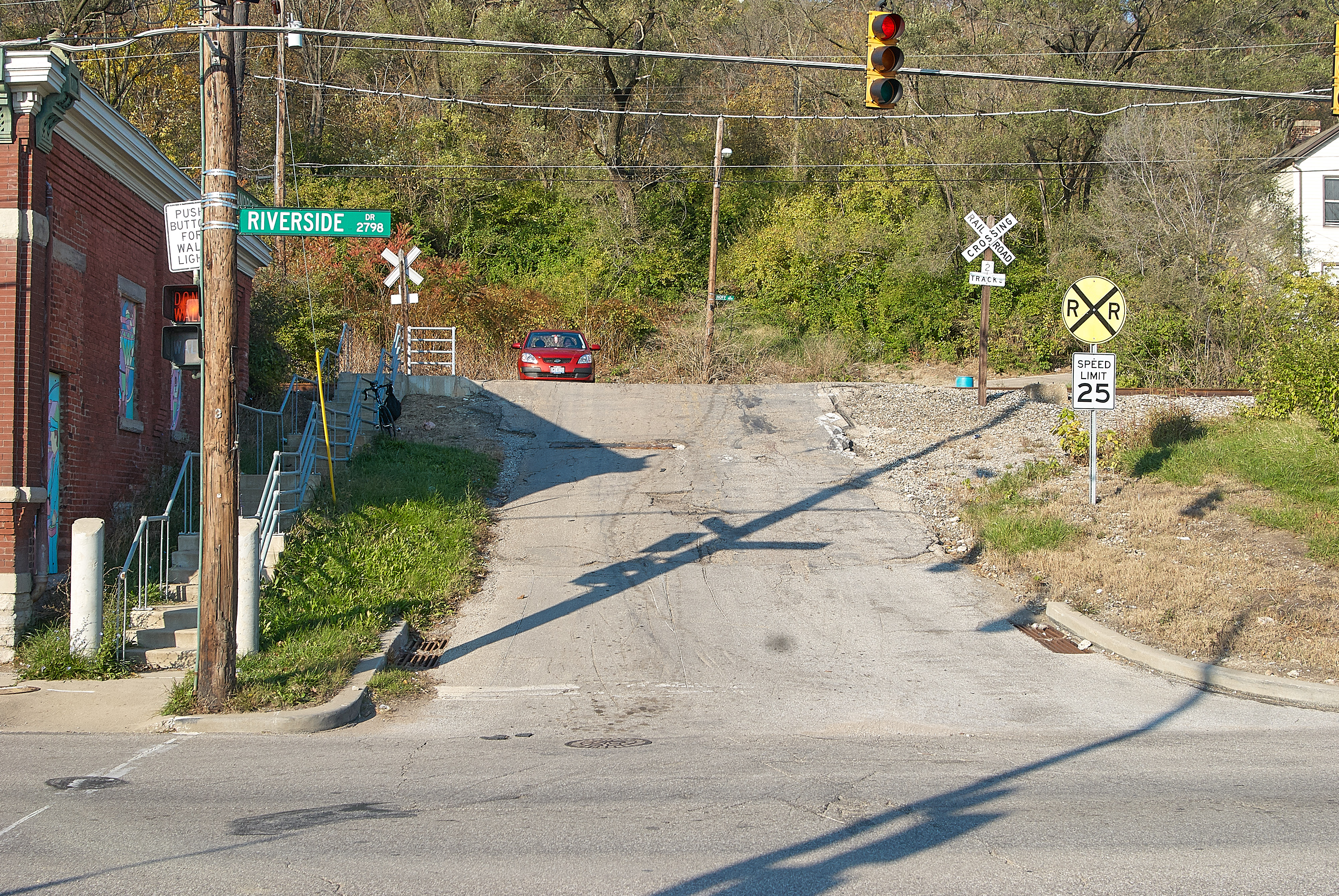 An old Electro-Matic pressure pad traffic detector on St. Andrews Street in Pendleton, looking north across Riverside Drive up St. Andrews towards the former PRR/Little Miami Railroad. The old East End office of the Cincinnati Street Railway is at the left. The pressure pad is about 3/4 of the way up the street on the left, partially in the building's shadow. This was removed when the street was repaved.