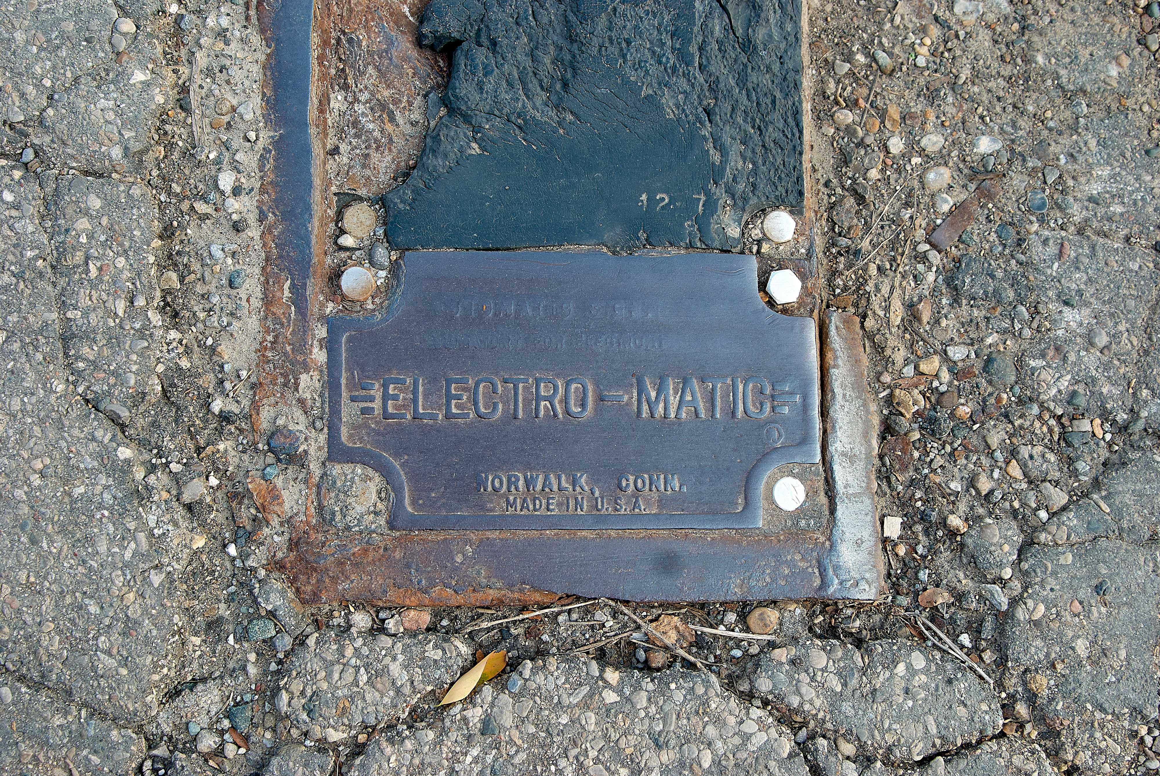 Detail shot of the old Electro-Matic pressure pad traffic detector on St. Andrews Street in Pendleton.