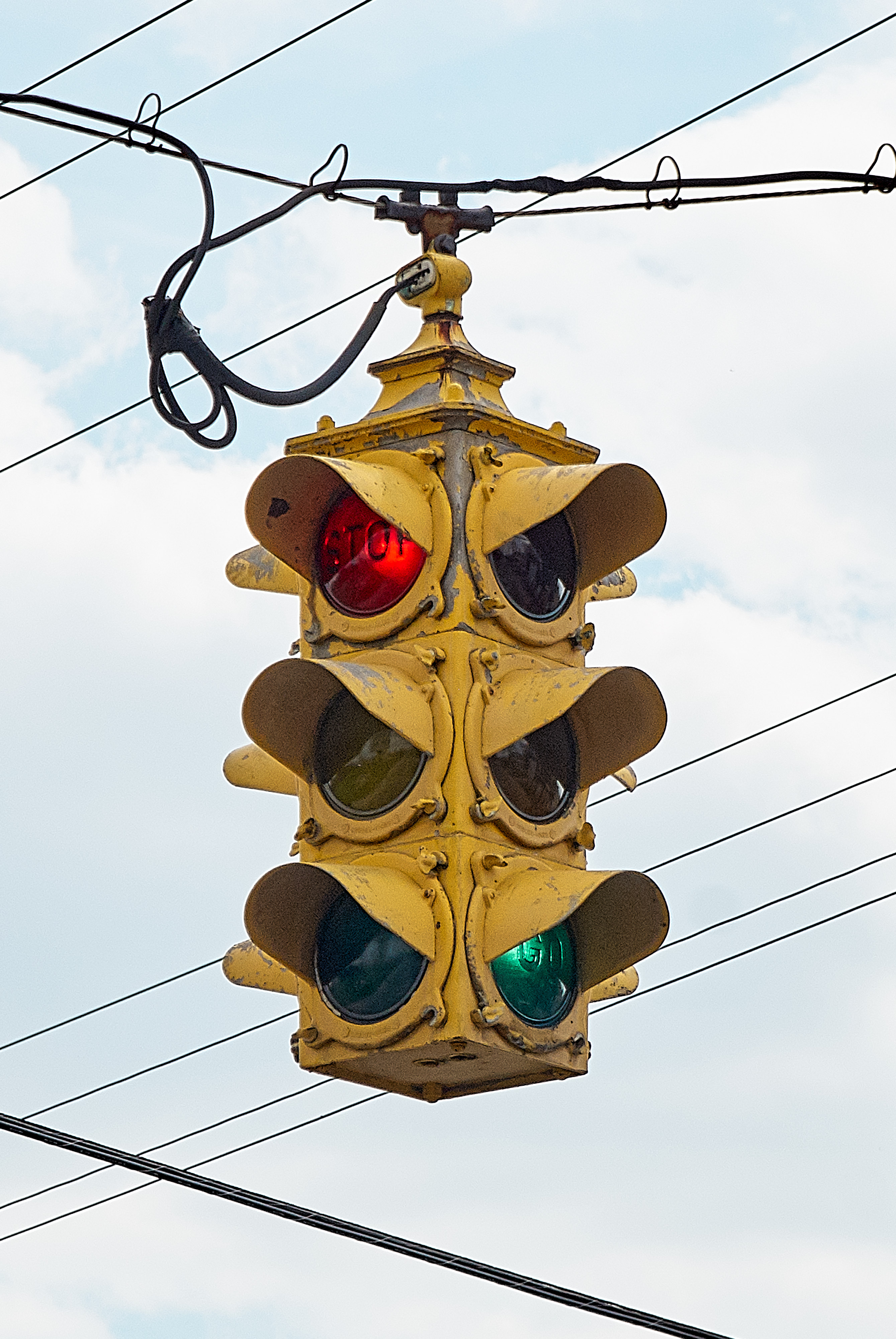 Another close-up of the 1926-1929 era Crouse-Hinds Type T signal at Sherman and Allison in Norwood. Notice that in this view both of the lit signals have their original lettered lenses. In fact, the "STOP" lens still has some black paint in the lettering, which is necessary for the lettering to show up properly.