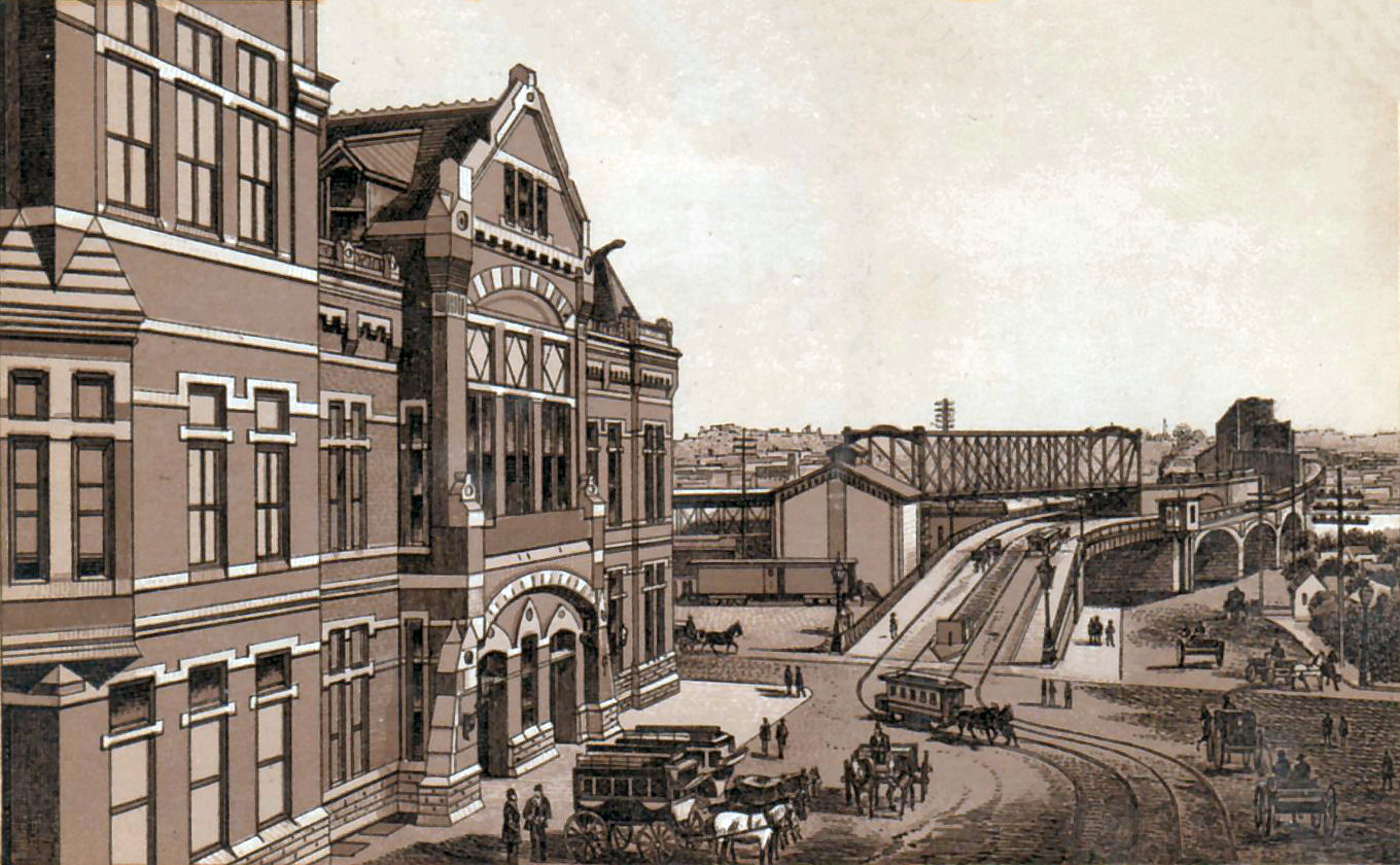 Historic drawing of the Pennsylvania/Little Miami Railroad station and the approach to the Newport & Cincinnati/L&N Bridge.