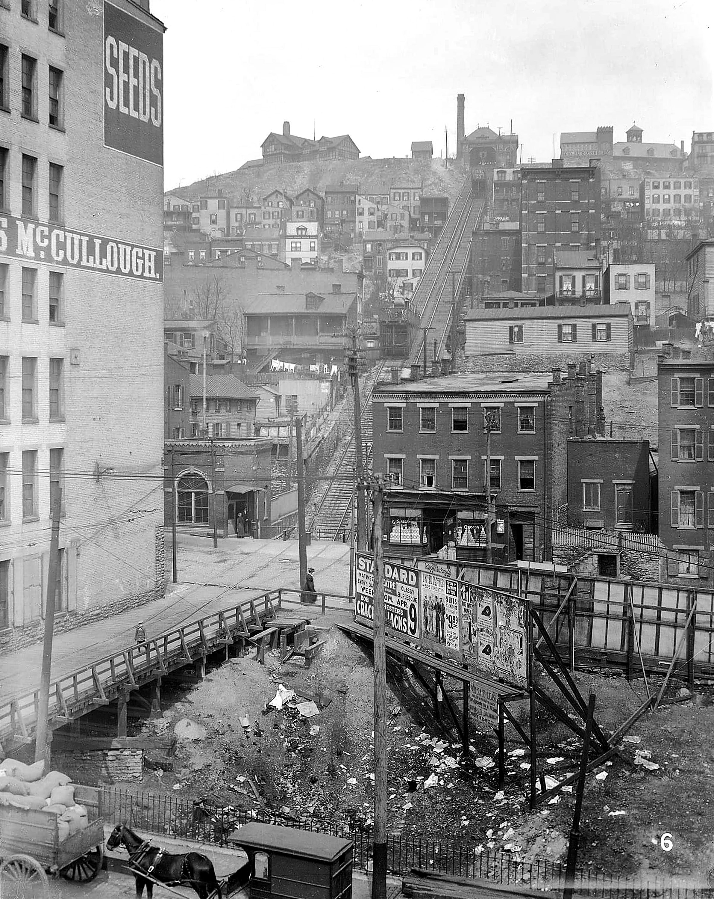 Historic photo of 5th and Lock Streets at the base of the Mt. Adams Incline. The horse and carriage is on Eggleston at the very very bottom. The wood bridge traversing what little is left of the long-abandoned Miami & Erie Canal at this location. While the rest of the canal remained navigable into the 20th century, the run from Broadway, at what would later become the Hamilton County Justice Center and the Casino, and the Ohio River required a 100' drop and ten locks. Since canal boats couldn't navigate the Ohio River anyway, this segment of the canal had been little used and it was formally abandoned in 1863. The locks were buried under Eggleston Avenue, but a mill race was left on the east side of the street to provide water power to the factories along the way.