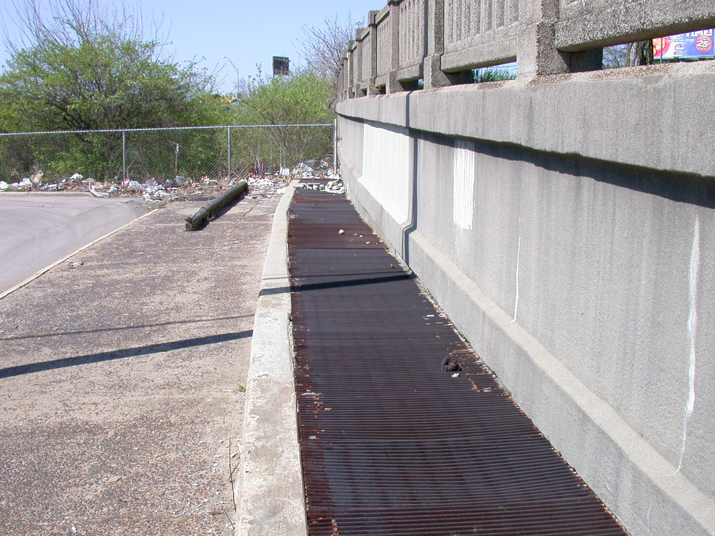 Central Parkway railing and subway vents along Colerain Avenue north of Brighton Corner, looking north. These vents were for the Brighton subway station under Central Parkway. They appear to continue for a significant distance past the end of Colerain Avenue. This is the first of several places that Colerain Avenue was severed by I-75.