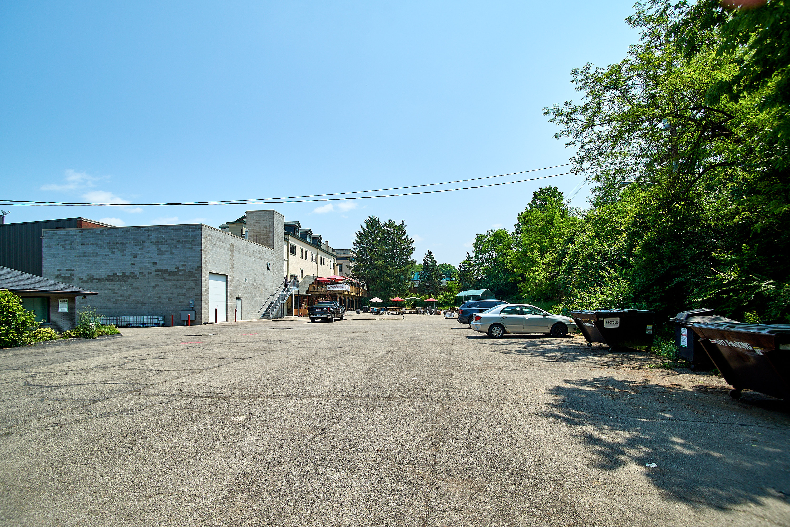 Subway and Miami & Erie Canal right-of-way behind Wiedemann's Brewery in St. Bernard, looking east from the vantage point of the previous photo. The canal itself was in the woods to the right above the level of the parking lot.