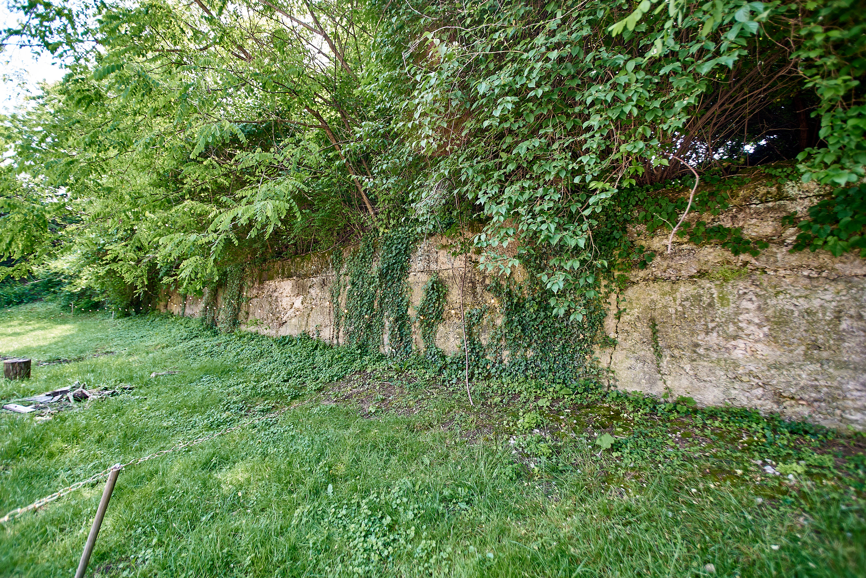A recent view of the concrete wall from the previous historic photos. The canal was significantly above grade here, hugging the side of the hill on which the southern part of St. Bernard sits. The bed of the canal was filled in over time to provide additional parking for the former Chili Time restaurant at Vine and Phillips.