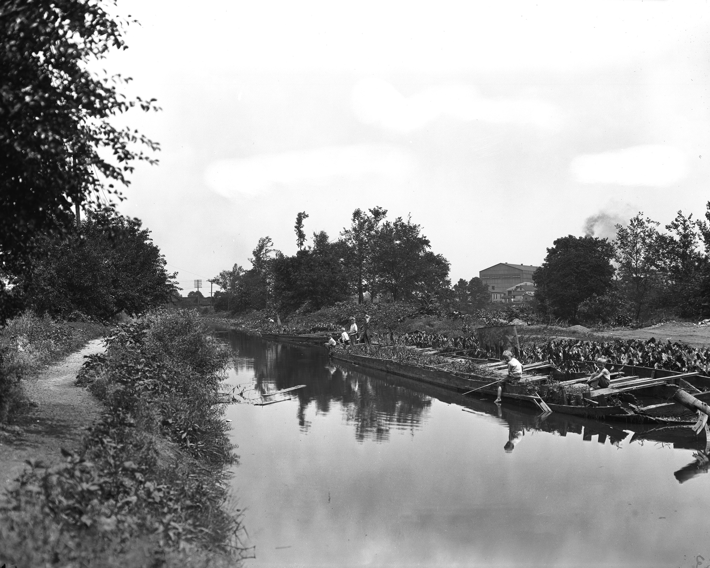 Historic photo of the Miami & Erie Canal north of Ross Avenue in St. Bernard on July 8, 1924, looking northeast from the vantage point of the previous photo. The boys are fishing from derelict hulks oof old canal boats.