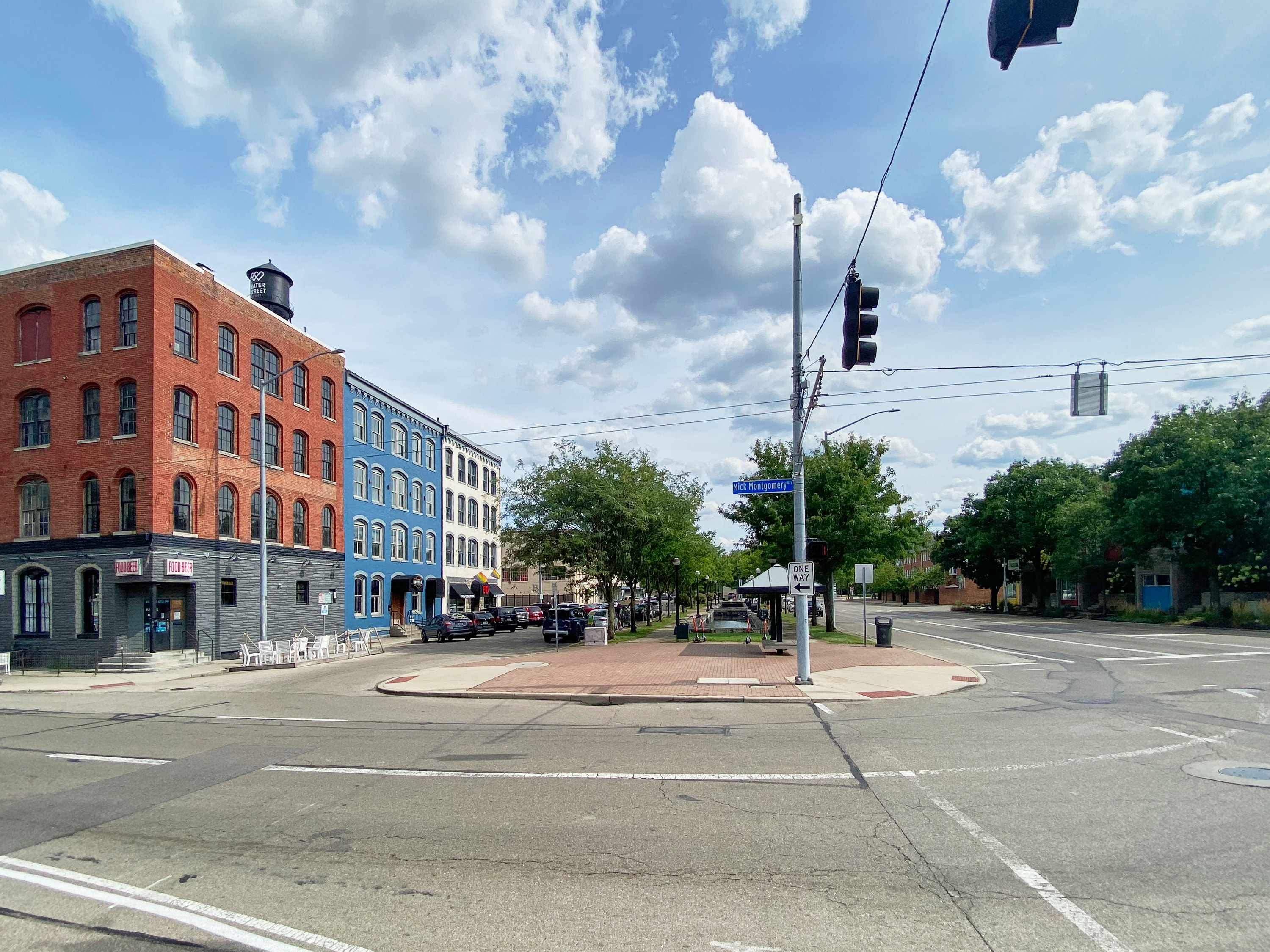 Another view of the historic canal-era warehouse buildings at 1st and Patterson and their relationship to the canal, looking south across 1st.