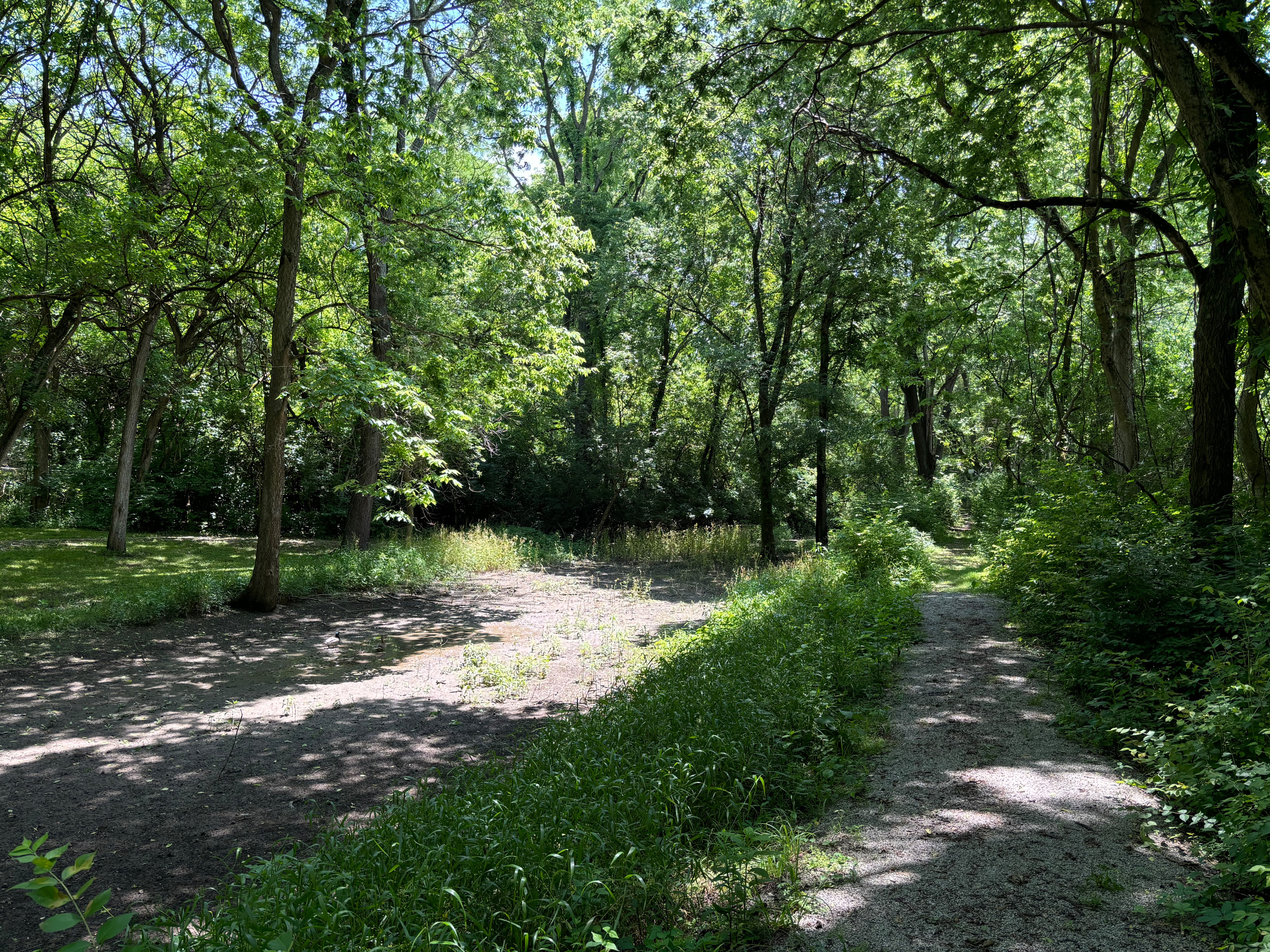 Miami & Erie Canal channel and towpath in Canal Lock Park in Huber Heights, looking south.