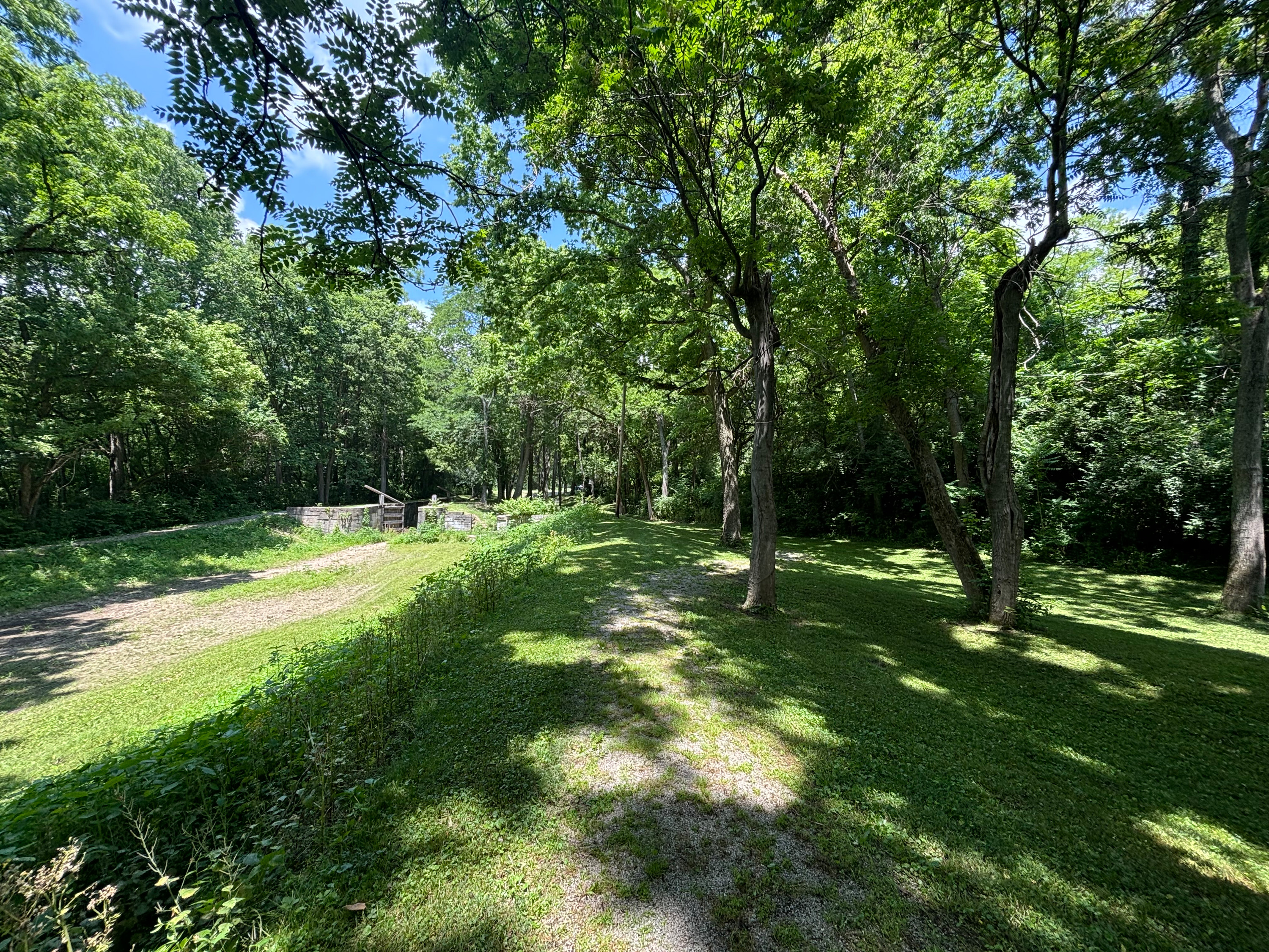 Miami & Erie Canal channel and heelpath in Canal Lock Park in Huber Heights, looking north towards lock #18. The depression at the right is an old mill pond that was filled from the canal.