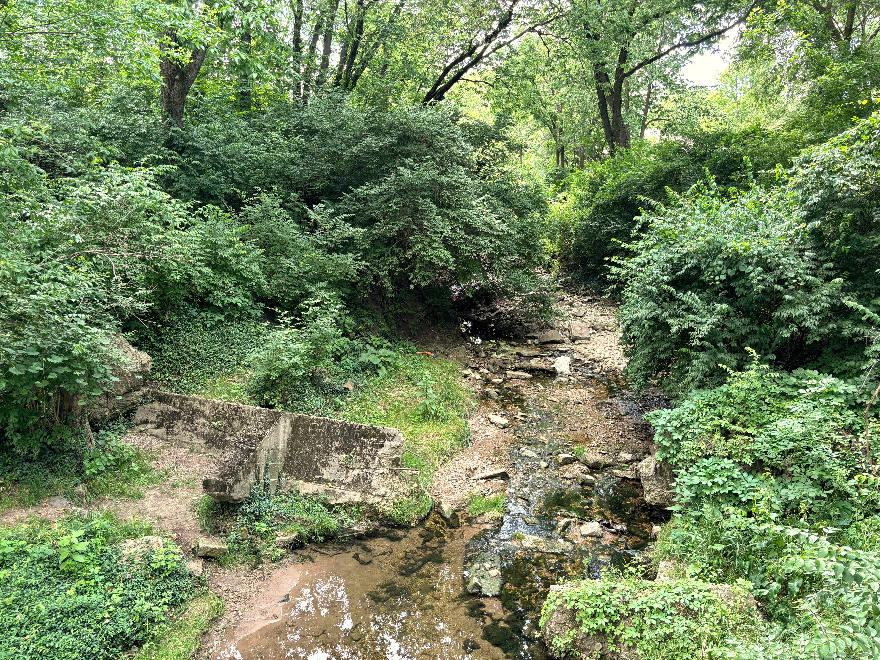 Miami & Erie Canal aqueduct remains over an unnamed creek in Tipp City next to Parkwood Drive, looking west from the Great Miami River Recreational Trail.